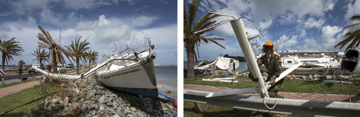 Onderweg naar de hoofdstad Philipsburg doemen opnieuw Nederlandse militairen op. Genisten van 11 LMB zijn druk in de weer met slijptol en betonschaar. “We maken de wegen vrij”, verklaart soldaat 1 Luuk van Bennekom. Een mast van een luxe zeilschip verspert de helft van de weg. “Chaotisch en gevaarlijk”, zucht hij. “Er is nu maar 1 rijbaan beschikbaar en er is niemand die het verkeer leidt.”