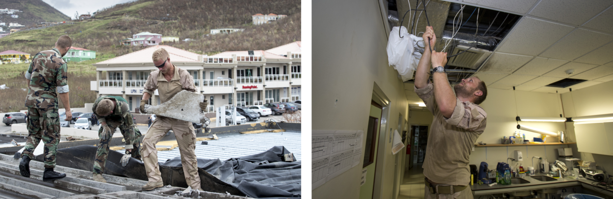Een paar kilometer verderop staan landmachtgenisten samen met mariniers op het ziekenhuisdak. Onvermoeid loopt korporaal Harm heen en weer met betonpuin. “Normaal houden deze betonblokken het dakleer op zijn plek”, aldus de genist. “Door de orkaan zijn ze opgetild en meters verderop neergesmeten. In stukken. We proberen het lekke dak nu te repareren.” Een klus die niet meevalt.