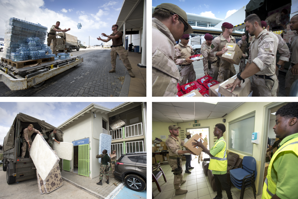 De rode baret wijst op kartonnen dozen, kratten babymelk en pallets vol flessen water. “Inmiddels is 70 procent van de hulpgoederen verdeeld”, verzucht hij. “Toen wij hier aankwamen, stond het helemaal vol met pakketten. De eerste dagen na Irma konden ze nergens heen. Het ontbrak aan organisatie en er was te weinig mankracht. Nu zit er een goede flow in.”