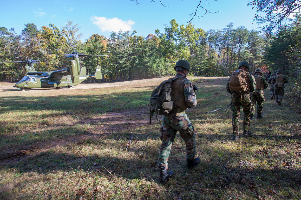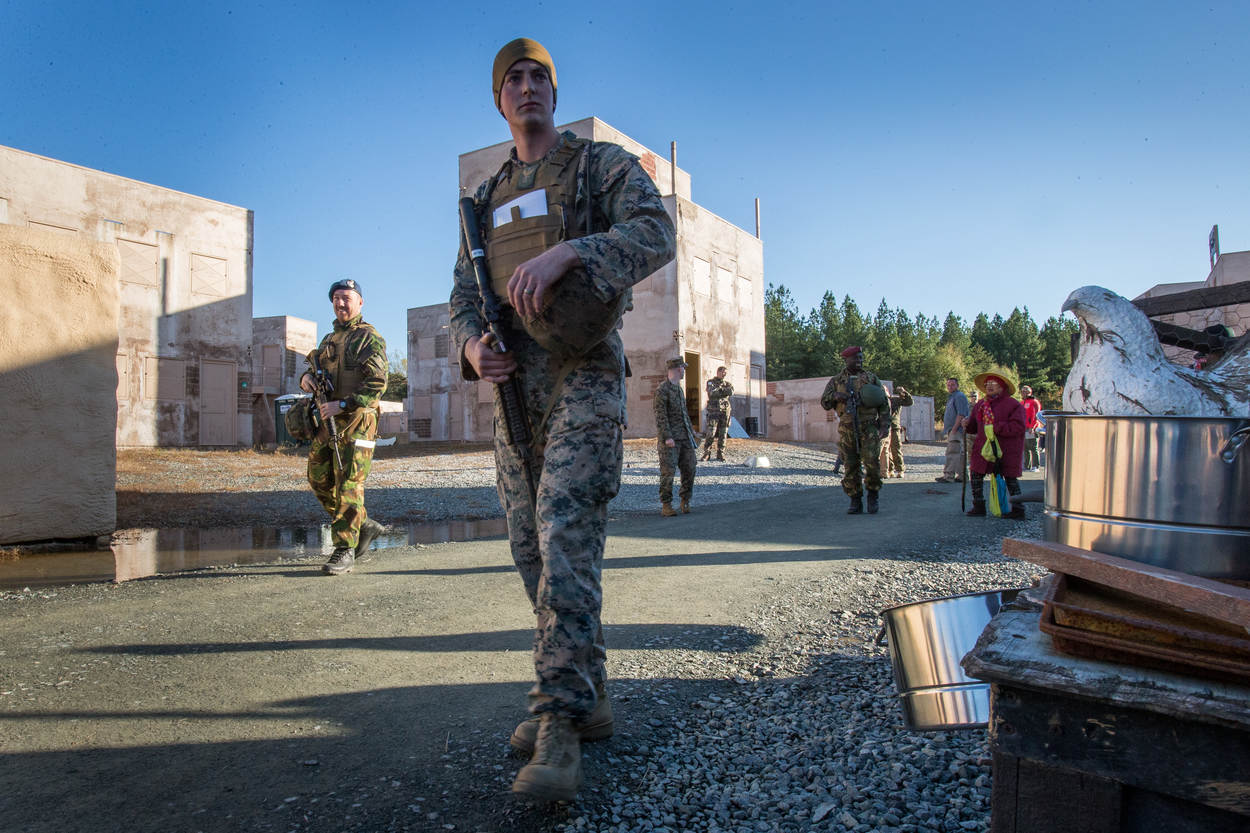 De Amerikaanse oefenleiding gaat vrij ver om de beleving van de deelnemers tijdens de quasi humanitaire hulpverleningsoperatie te stimuleren. Zo is de bemanning van een deelnemend MV-22 Osprey ondersteuningsvliegtuig ingefluisterd om voor de meevliegende deelnemers een paar extra rondjes te vliegen. Om een realistische afstand tussen thuisbasis en rampgebied uit te beelden. Want de training vindt gewoon plaats in een oefendorp, gelegen in de enorme ‘achtertuin’ van Quantico. “Een zware tyfoon heeft het Filipijnse eiland Mindanao getroffen”, voegt teamcommandant eerste luitenant Mac een zinnetje uit het scenario toe.