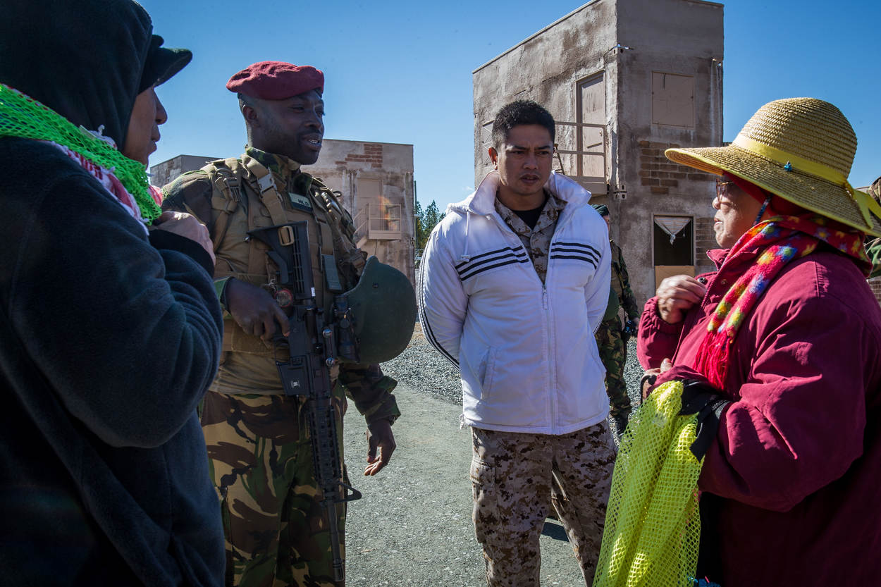 Luitenant Mac doet het woord, de tolk vertaalt. Op de achtergrond lachen de roleplayers van Filipijnse komaf besmuikt. “Ja, toneelspelen kunnen ze wel”, slaat een Amerikaanse marinier in het voorbijgaan de spijker op de kop.