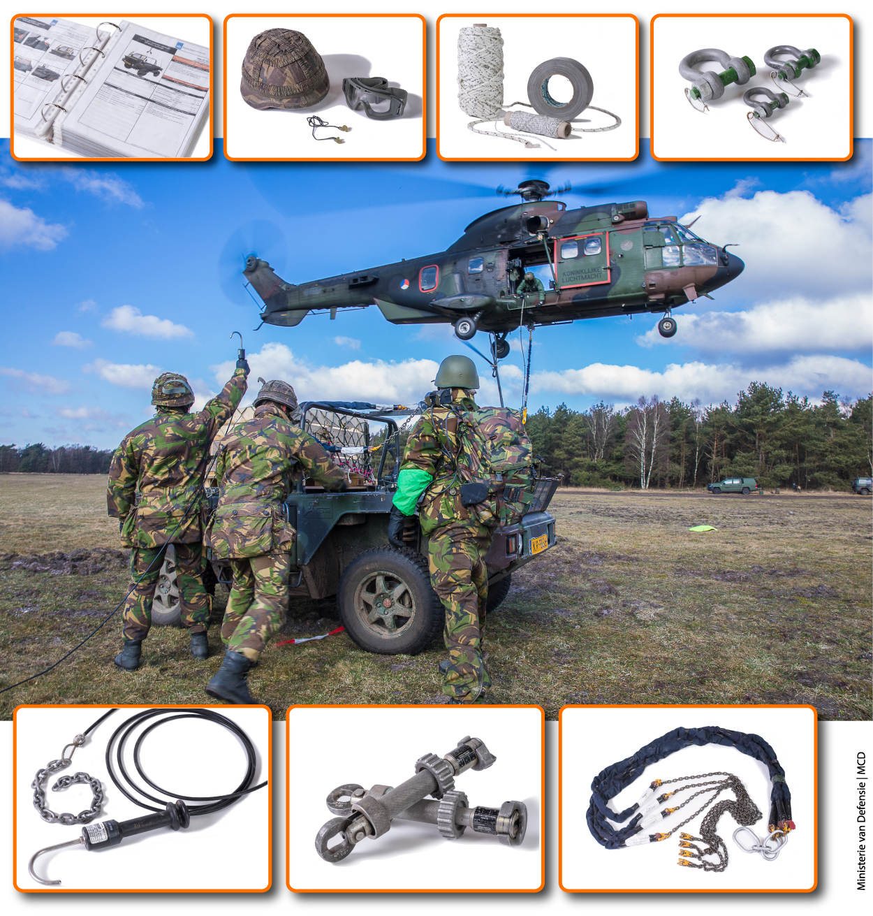 Als een helikopter lading moet vervoeren, kan dat op 2 manieren: intern of hangend onder de romp. Soldaat-1 Casper van Vliet is één van de ‘bevo-seals’ van 11 Luchtmobiele Brigade, de club die ervoor zorgt dat helikopters in het veld naar de juiste plek worden gegidst (marshallen) om lading op te pikken, en dat die lading goed en veilig geprepareerd is voor transport (riggen). Uit de ‘gereedschapskist’ van Casper: