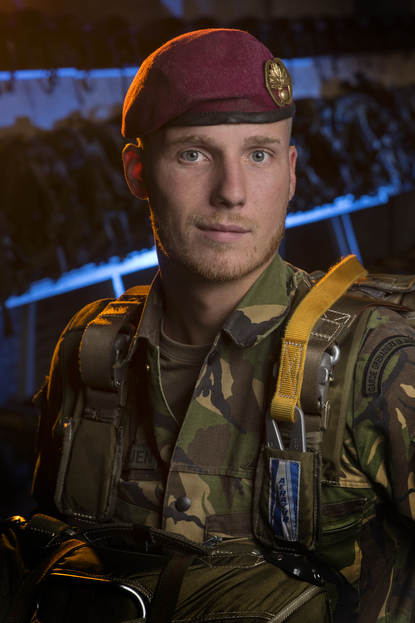 De keuze om parachutist te worden is er niet echt. Je kunt wel je voorkeur uitspreken, maar het kader bepaalt. Supervet toen ik de opleiding in mocht. Na een week grondopleiding spring je 8 keer, waarvan 1 nachtsprong. Toen had ik mijn wing. Inmiddels heb ik in 5 jaar 25 sprongen gemaakt in binnen- en buitenland. Het gaat er vooral om dat je current blijft. In de meeste oefeningen waarin ik meedraai, voeren we air assaults uit.”