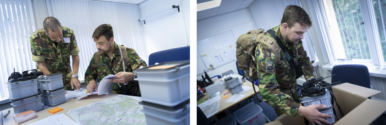 Veldman heeft verbindingen nodig. 3 portofoons gaan naar zijn groepscommandanten en zelf haalt hij een satelliettelefoon, een laptop en smartphone op.