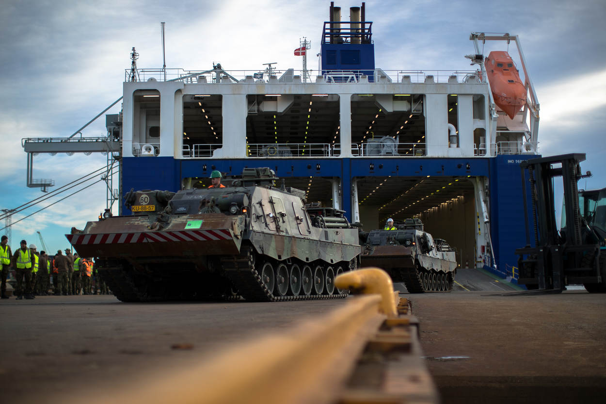 Trident Juncture mag dan in vele opzichten bijzonder zijn, 1 ding is even regulier als elke andere militaire oefening: het belang van goede logistieke lijnen. Een van de ‘radertjes’ is de Deense Ark Germania van DFDS Seaways. Het imposante vaartuig legde medio oktober aan in Frederikstad. Eenmaal aangemeerd spuwde het bijna 200 meter lange schip duizenden tonnen militair materieel uit.