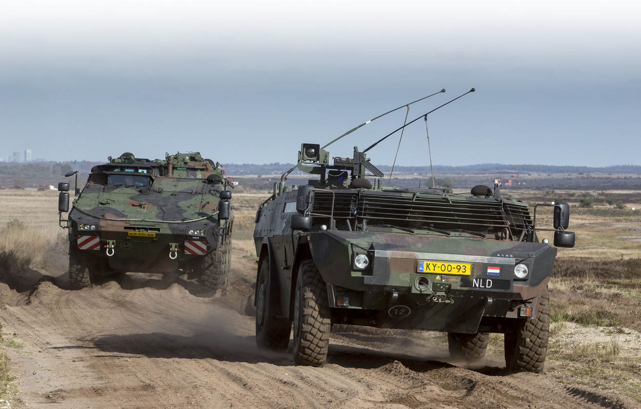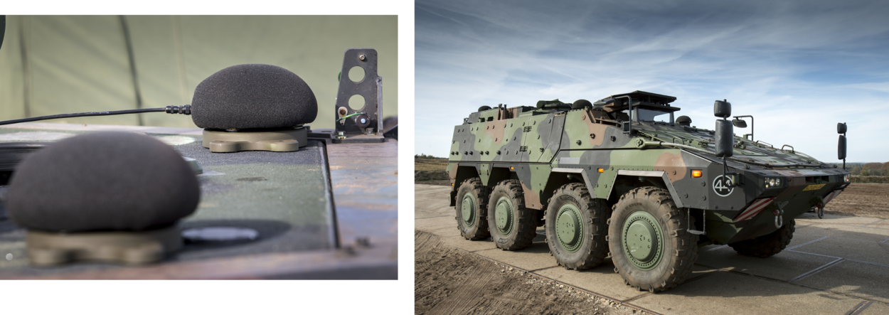 Sensoren bovenop een Boxer en een Fennek. De pantservoertuigen produceren geluid dat de apparatuur van Microflown kan verstoren. Voor een systeem dat de krijgsmacht daadwerkelijk kan inzetten, zal hoe dan ook rekening moeten worden gehouden met veel ruis. Omgevingsgeluiden, geschreeuw, loeiende motoren, ratelende boordwapens. Microflown test of hun middelen in een gevechtssituatie precies kunnen vaststellen waar zich schutters bevinden en van welke wapens ze zich bedienen.