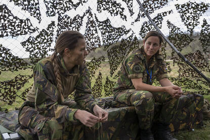 Voor chauffeur/verzorger soldaat-1 Nadieh – pas op haar eerste functie – is alles nieuw. “Ik vind het heel bijzonder om te zien hoe de Engelsen werken”, vertelt ze onder de camonetten achter haar Zau. “We hebben eergisteren een bevelsuitgifte van ze gehad. Wij spreken hun taal en passen ons aan, maar we delen ook veel hoor.” Onbewust benadrukt ze haar laatste opmerking meteen, door haar spork in een opgewarmde Britse lunch te steken.