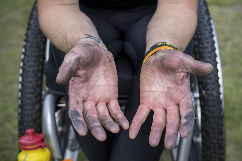 “Ik rol met een snelheid van 10 à 11 kilometer per uur over het wielrenparcours. Door de Kennedymarsen, de Dodentocht en obstacle runs ben ik het wel gewend, die afstanden. Deze maand rol ik voor de 2e keer de Nijmeegse Vierdaagse. Fysiek lukt dat allemaal wel. Al hakt de Grebbeberg er wel in. Ik heb geen last van verzuring, wel van spierpijn. Het mentale aspect vind ik het mooist. Er komt altijd een breekpunt door vermoeidheid. Dóórgaan en je grenzen verleggen, dáár gaat het om. Remmen doe ik bare hand, dat vind ik een uitdaging en ik heb meer contact met mijn stoel. Die ruwe handen trekken met een zalfje wel weer bij.
