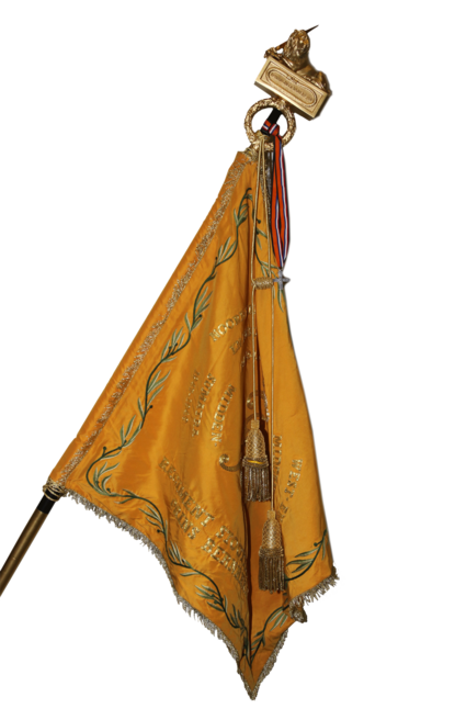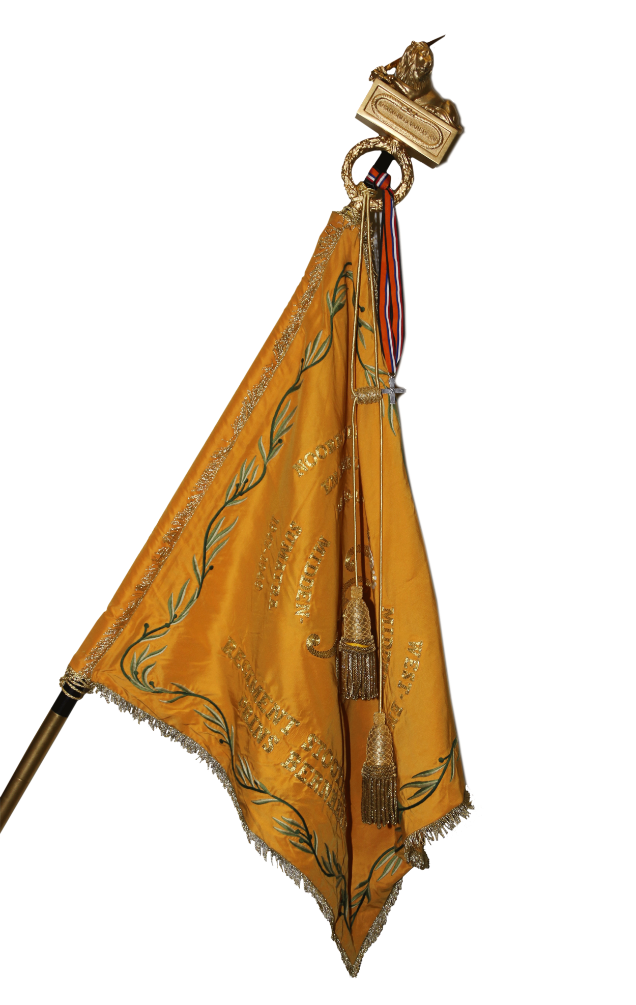 Het vaandel is de ‘vlag’ van een eenheid, geschonken door de koning. Erop staat de gestileerde eerste letter of het monogram van de naam van die vorst. Als de vlag is bevestigd aan een lange stok, heet het een vaandel. Eenheden te paard kregen een kleinere vlag met een korte stok: de standaard. De opschriften op vaandels worden altijd door de vorst toegekend. Vroeger namen de troepen de vaandels mee als ze ten strijde trokken. Tegenwoordig staan ze symbool voor saamhorigheid, en trouw van de eenheid aan de vorst. Foto: Dennis Boom.