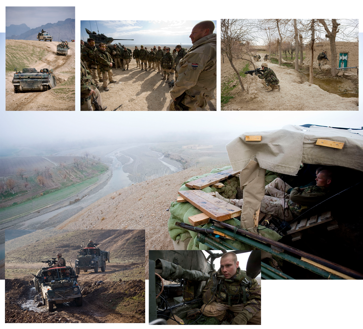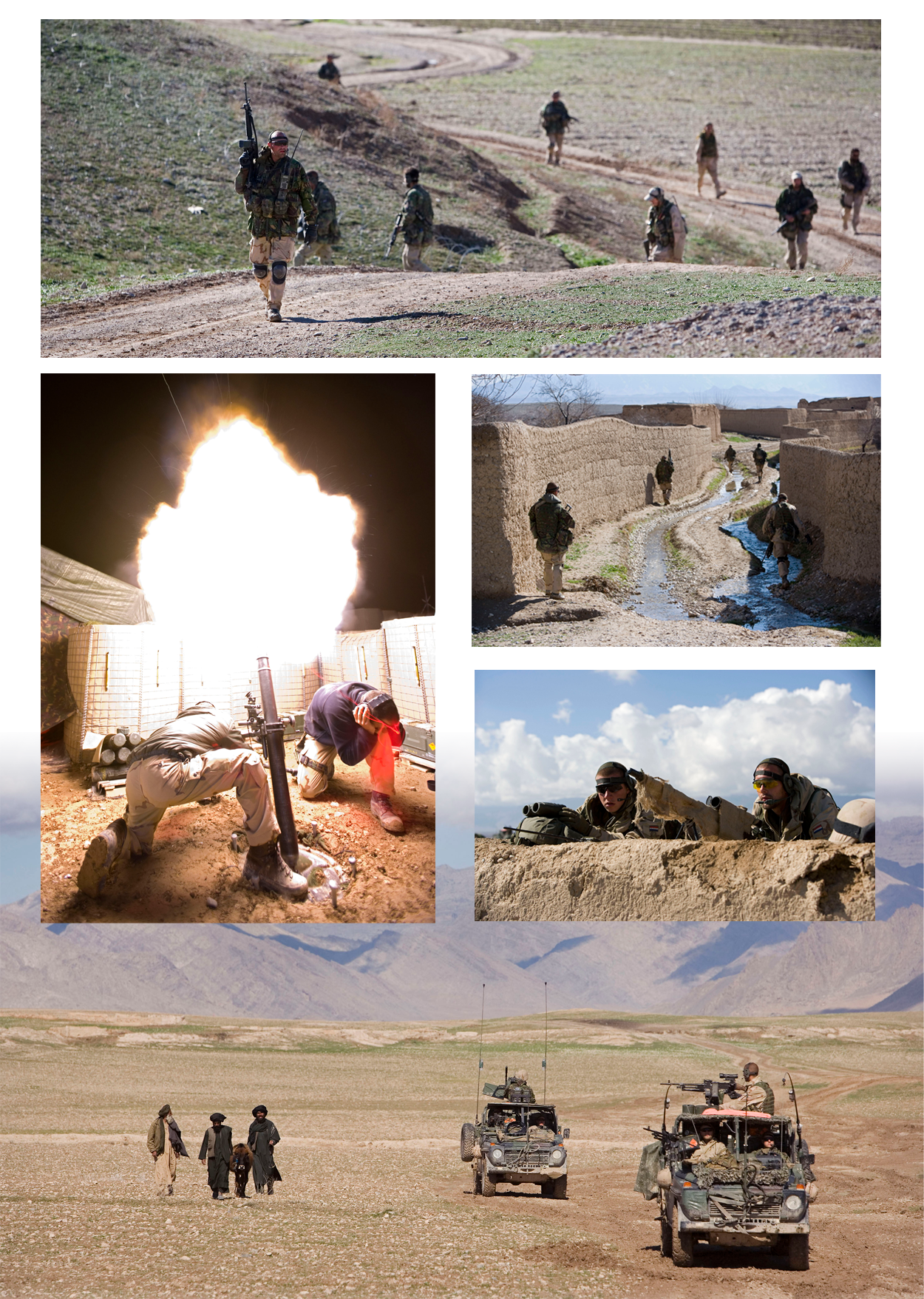 […] Op dat moment hoorde ik van dichtbij achter ons een mitrailleur ratelen en sloegen de kogels in de qualamuur naast mij en de grond om me heen in. In een flits dook ik achter een laag muurtje en opende direct het vuur in de richting vanwaar we werden beschoten. Daarna brak de hel los en werden we van alle kanten onder vuur genomen. Naast mij ratelde de Minimi-schutter zijn mitrailleur leeg en samen met hem gaf ik dekkingsvuur voor diegene die achter ons aan kwam. Toen ik gaten zag verschijnen door het muurtje waar ik achter zat, besloot ik hier snel af te breken. Om de hoek van de dichtstbijzijnde quala zocht ik een nieuwe dekking. Direct werd ik vanaf een dakrand op ongeveer 20 meter onder vuur genomen en ik beantwoordde dit vuur onmiddellijk. In mijn rug werd ik gedekt door iemand van de A-groep die ook maximaal aan het vuren was. Ik hoorde de kogels langs mijn hoofd fluiten. Voor iedereen die in onze groep zat was het nu vechten op de vierkante meter. Ook het PRT-personeel (Provincional Reconstruction Team, red.) moest meedoen, wat ze ook zeker deden. Achter mij hoorde ik de groepscommandant naar zijn mannen schreeuwen, de helmen moesten op, sectoren overnemen dus. In no time gooiden we handgranaten naar onze tegenstanders op de quala en konden we een strong point innemen. […]