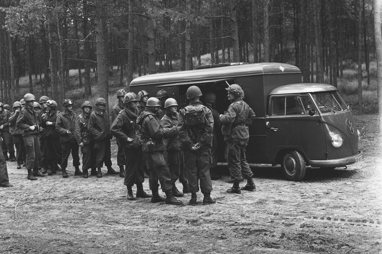 Militairen in de rij voor een CADI-wagen, in dit geval een VW Transporter T1, in de jaren 70.