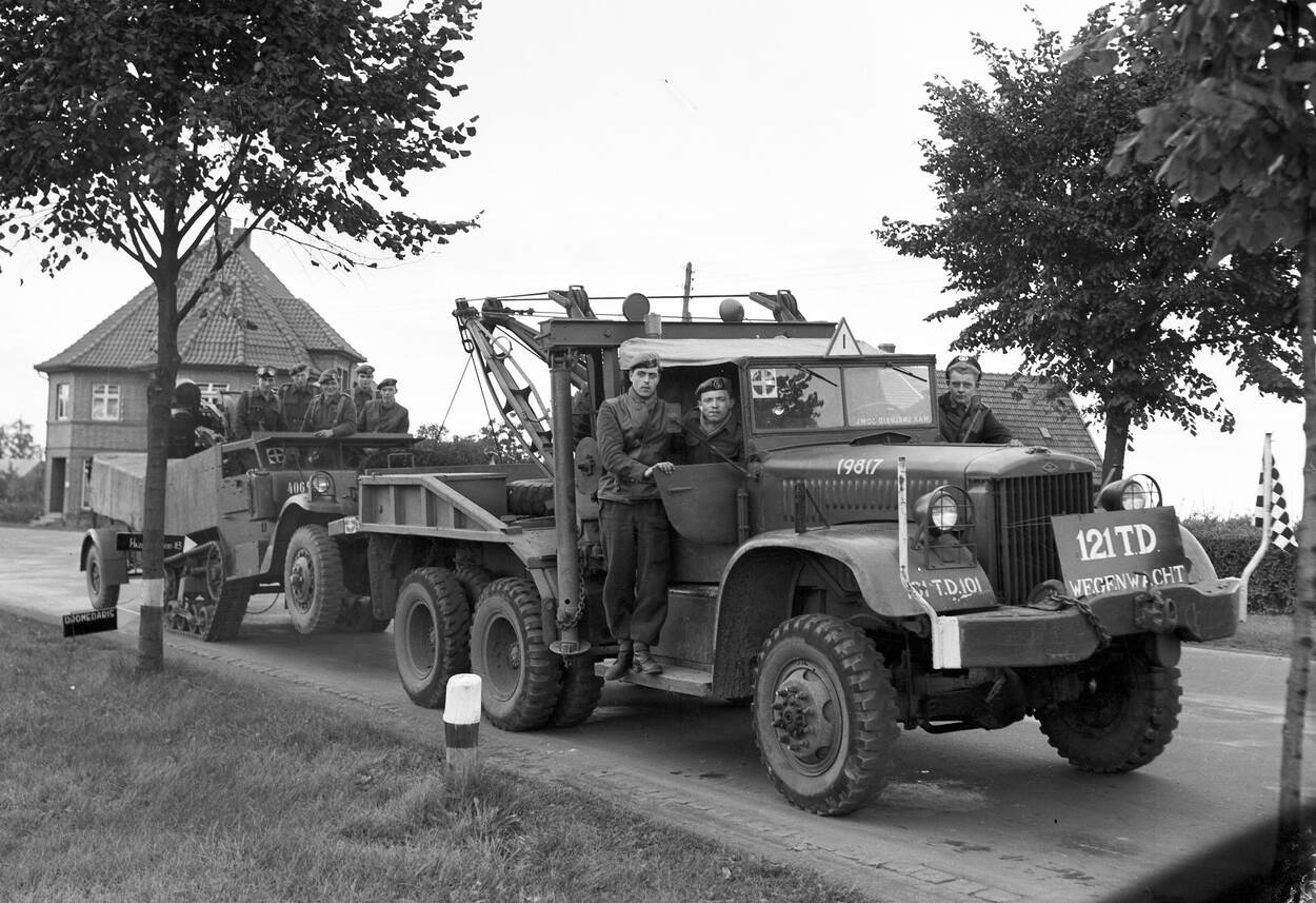 Een Diamond T 969 takelauto sleept tijdens de oefening Battle Royal in september 1954 een gestrande half-track van een verkenningseskadron weg. In de eerste jaren na de Tweede Wereldoorlog nam de Nederlandse landmacht veel geallieerde materieel over.