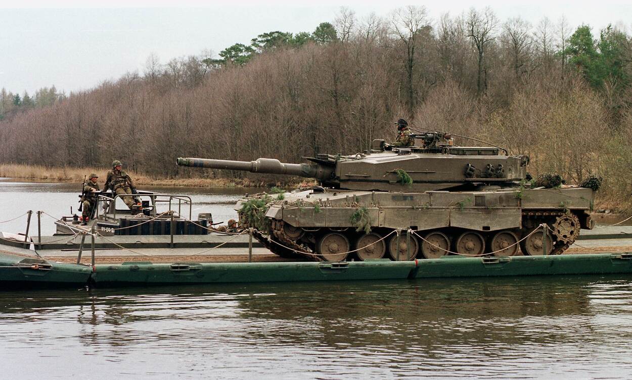 Een Leopard 2A4 gevechtstank passeert een waterhindernis over een pontonbrug tijdens oefening Rhino Drawsko in april 1997. Een jaar ervoor werden 114 soortgelijke tanks aan Oostenrijk verkocht. In de 20 jaar erna werden de bijna 300 resterende tanks ook afgestoten.