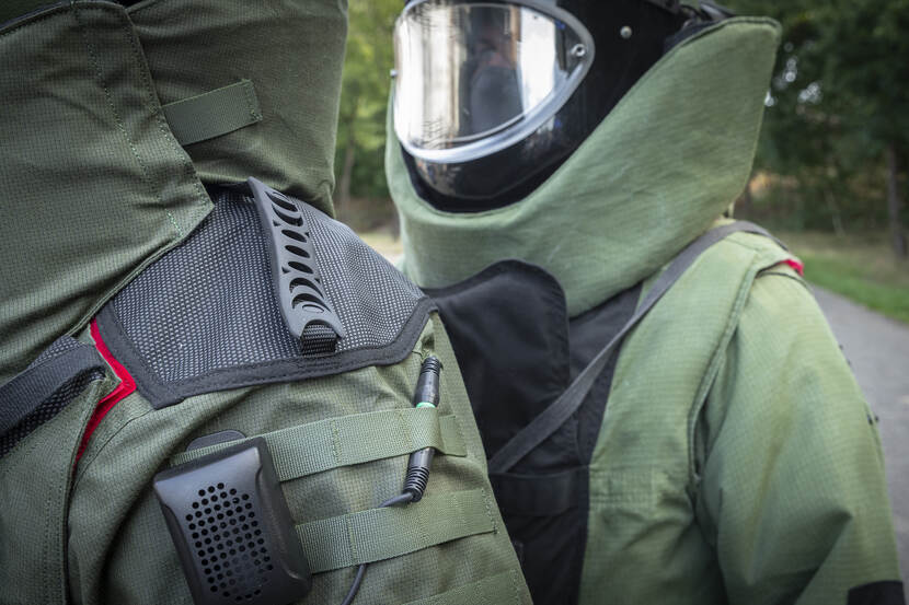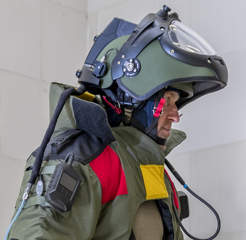 Het paradepaardje van bompak nr. 10 is voice control. “Alsof je van een Nokia 3310 naar een iPhone X gaat”, benadrukt EOD’er sergeant-majoor Maarten. ‘Licht aan’, ‘licht rood’, ‘ventilatie uit’: het zijn zomaar een paar commando’s die het pak laten werken. “Handmatige bediening is prima, behalve als je je handen vol hebt. En laten wij nu vooral met onze handen werken.”