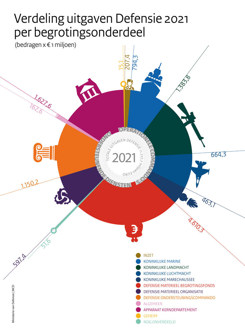 Ondanks het iets ruimere budget behoort Nederland ook in 2021 nog altijd tot de landen met de laagste bijdrage aan de NAVO. De bedoeling is dat die in 2024 op 2% van het bruto binnenlands product (bbp) zit. De verwachting voor 2021 is een bbp-percentage van 1,48%.