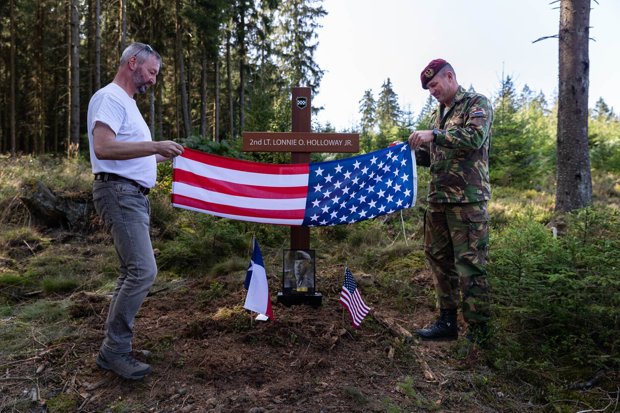 Een groepje militairen van 13 Infanteriebataljon Regiment Stoottroepen Prins Bernhard loopt door het Belgische Dreiherrenwald, pal op de grens met Duitsland. Ze torsen een houten kruis met betonnen voet met zich mee. Op de dwarsbalk staat ‘2nd lieutenant Lonnie O. Holloway jr.’. Het logo van de 99th Infantry Division en een kunststofplaat met een foto en een levensbeschrijving geven meer duidelijkheid. Op een voor een buitenstaander willekeurige plek graven de militairen het monument in.