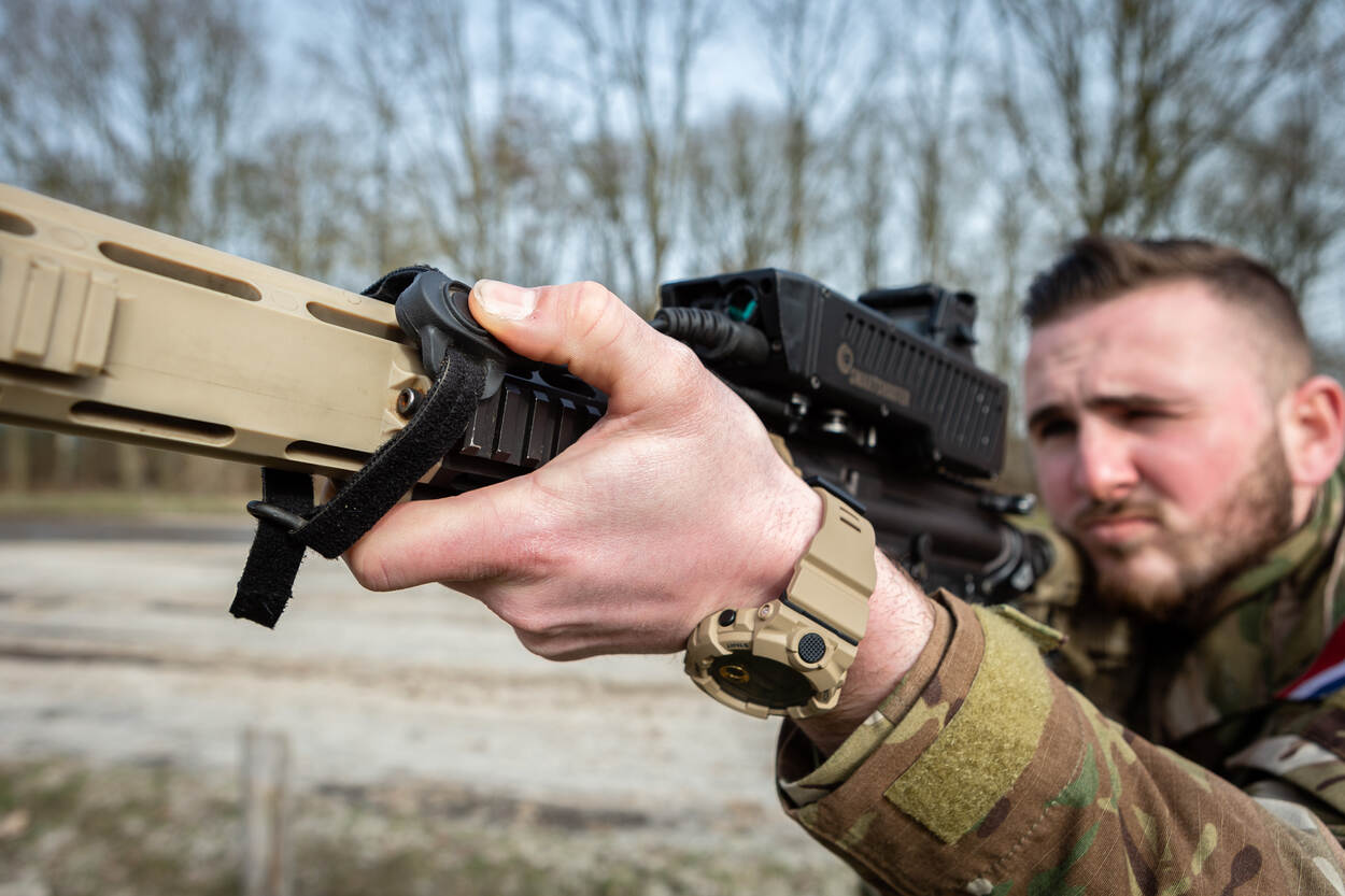 “Eigenlijk hebben we bij de manoeuvre-eenheden geen middelen om dit soort kleine drones mee uit te schakelen”, vertelt kapitein Daniël van Dijk, die de experimenten rondom de Smart Shooter begeleidt. “Toen we dit systeem tegenkwamen was de gedachte meteen: ‘mooie technologie!’ We kijken nu hoe het systeem werkt en welke toepassingen de Smart Shooter kan hebben in ons optreden.”