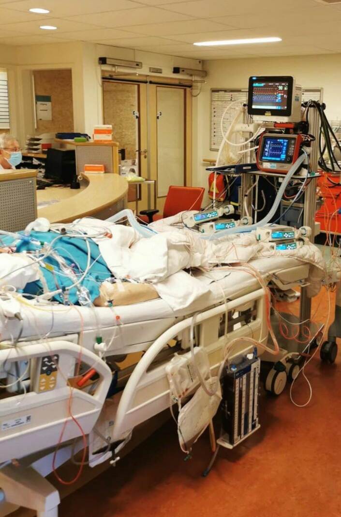 “Het begon met overplaatsingen uit Brabant, maar binnen 2 weken werden onze volledige IC en SEH overspoeld met COVID-patiënten. We schaalden op, bouwden onze recovery om tot IC. Die eerste piek was absurd. Als je 1 patiënt onder je hoede hebt die slecht gaat, kan je daar een hele dag druk mee zijn. Nu probeerde je zo 2 of 3 patiënten stabiel te houden. Dat waren zeker niet allemaal oude mensen. De meeste coronagevallen waren mensen tussen de 50 en 70 jaar, vaak met overgewicht, maar ik heb ook twintigers voorbij zien komen. Zelf raakte ik aan het begin van deze eerste golf ook besmet. Ik was 2 dagen ziek en voelde me snel weer oké. Ik merkte toen wel aan alles: ik móét werken, ik kan níet thuiszitten.