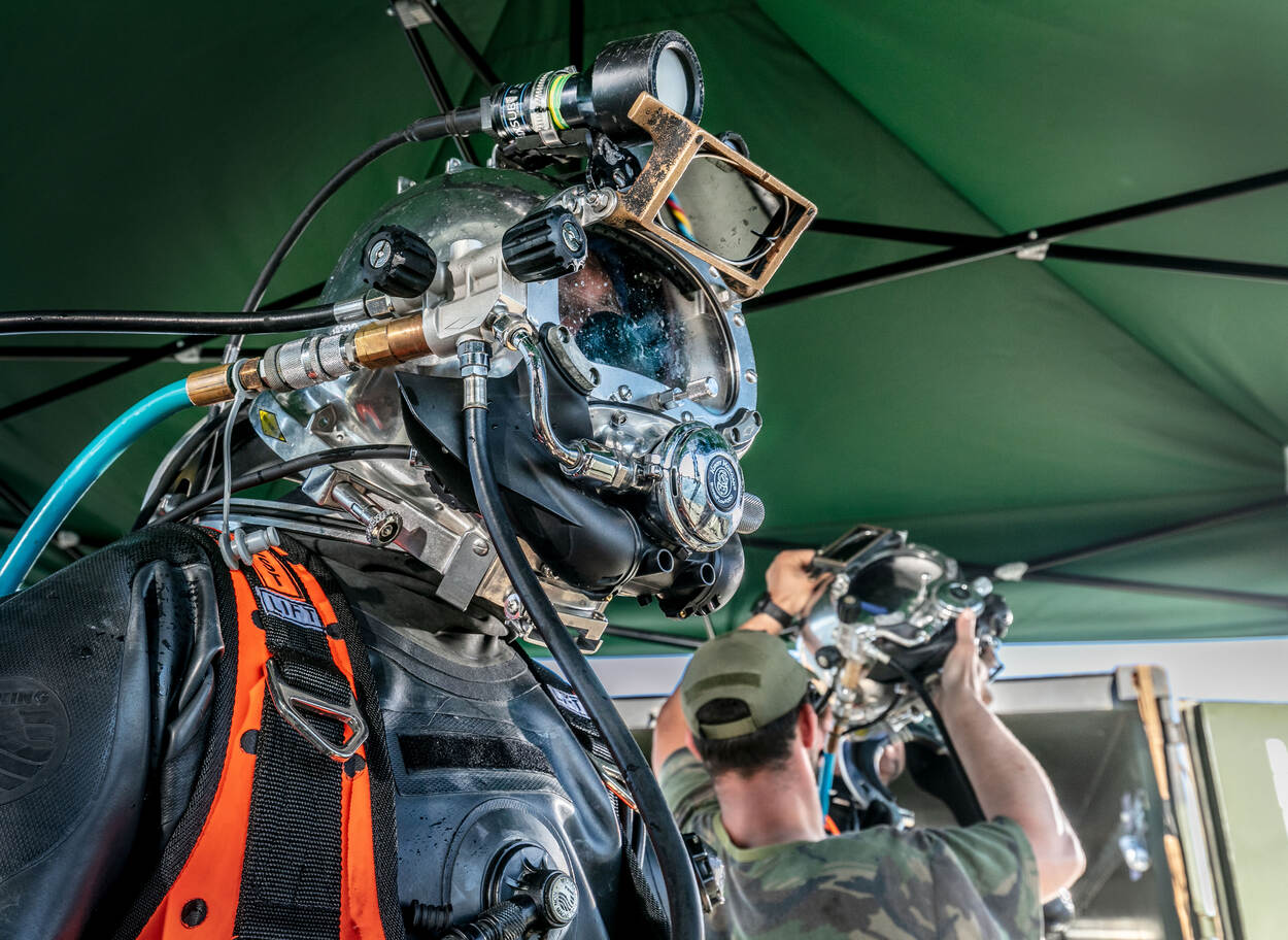Korporaal Kevin staat nog uit te druipen van een uurtje hard werken en zegt gelijk wat iedere duiker direct opmerkt: “Het water is hier werkelijk belachelijk helder. Dat maakt het lassen en schuren wel een stuk gemakkelijker”, bekent hij, met onderwaterfakkels nog in de hand. En wat hebben hij en zijn ‘bud' gedaan? “Het luik opgemeten voor de doorgang naar de boot. Vervolgens checken we ook nog wat er op het wrak staat en meten we verschillende platen op”, vertelt hij, terwijl het volgende duo zich alweer klaarmaakt om in vol ornaat te water te gaan.