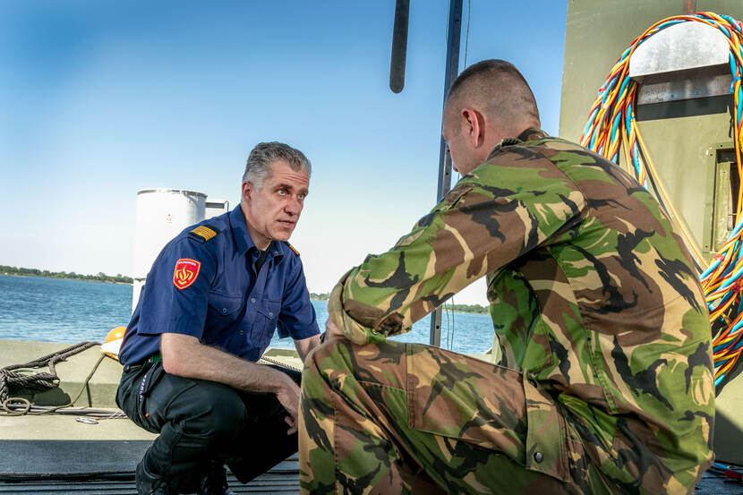 Die werkzaamheden konden trouwens pas beginnen na een uitgebreid ‘voorprogramma’ in de oefening, waarbij vooral de logistiek het behoorlijk voor de kiezen heeft gekregen. Vanuit de commandopost van 101 Geniebataljon in Ede kreeg de compagnie uit Hedel simpelweg de opdracht op te stomen naar Beers. “Dat lijkt een makkie. Ze wilden net met de voertuigen de poort uitrijden toen bleek dat er een boerenprotest in de oefening was gesleuteld. Alle wegen waren afgesloten. Vooral omdat we de compagnie wilden prikkelen over het water te gaan”, vertelt ‘bedenker’ adjudant Richard, werkzaam bij de sectie 3 (Operaties) van het bataljon.