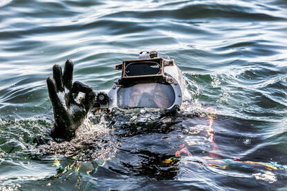 Met een bescheiden plons springt korporaal-1 Kevin van het duikerpeloton 105 Geniecompagnie Waterbouw de Kraaijenbergse Plassen in. Het voormalige zandwingebied bij Beers (Noord-Brabant) is een van de plekken in ons land waar oefening Engineer Victory gestalte krijgt.