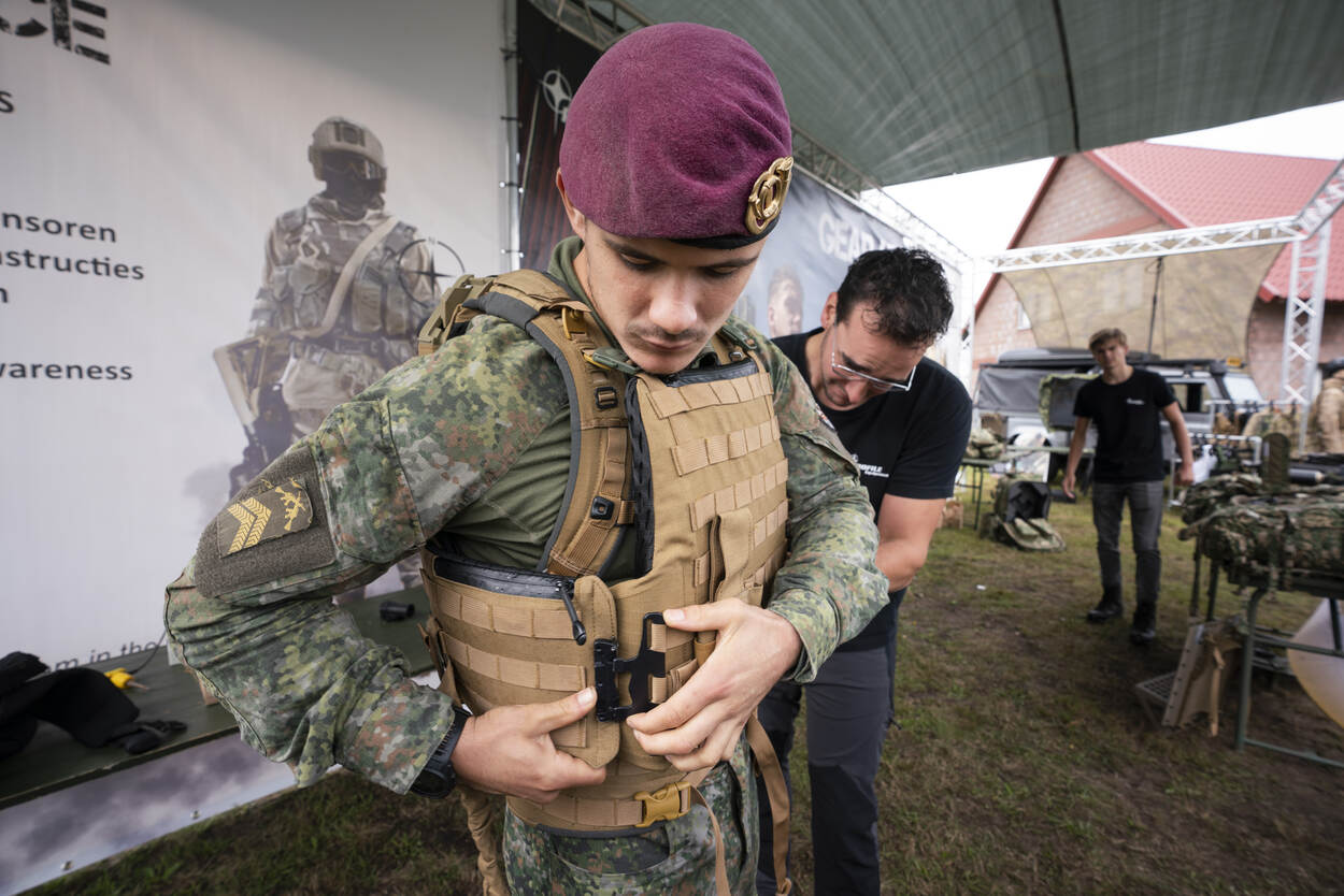 De stand is duidelijk in trek, want korporaal-1 Jannick van 11 Luchtmobiele Brigade wil de speciale rugzak wel eens proberen. Daaraan heeft zoon Pike Moerland tijdens een stage in Israël zijn steentje bijgedragen. “We krijgen heel veel informatie over wat soldaten willen en daar spelen we op in door onze producten te verbeteren.” De drukpunten zijn terugbracht tot een minimale belasting en ook is-ie zeer snel af te werpen om beweeglijker te zijn. “Laten wij nu net op zoek zijn naar een nieuwe sniperrugzak”, zegt Jannick.