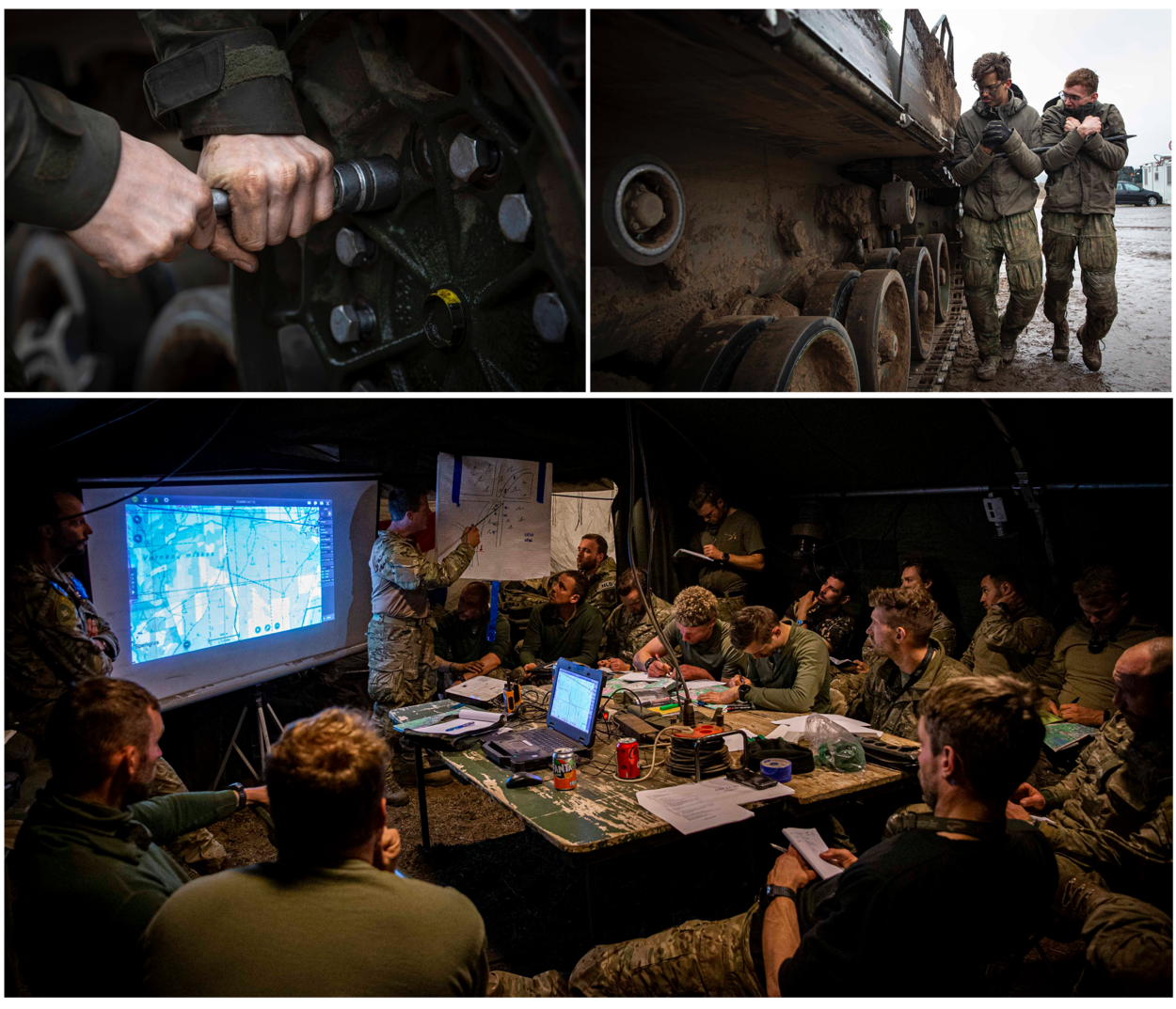 Terwijl de Amerikaanse oefenvijand, bijgestaan door Spaanse en Litouwse militairen, bezig is met het inrichten van de verdediging, wordt aan de Leopardtanks nog het laatste onderhoud gepleegd. Tankschutter korporaal Mugen showt zijn ‘mini-kantoor’. Een stoeltje in een kleine ruimte, ongeschikt voor mensen met claustrofobie. Omringd door knoppen met Duitse termen erop. “Hier heb ik net twaalf uur lang gezeten, want we moesten een Amerikaanse M1 Abrams waarnemen. Dan gaat alles pijn doen. De commandant vlak achter me, had het koud buitenluiks, ik juist bloedheet met de kachel bij mijn voeten. We hebben geen airco helaas.”