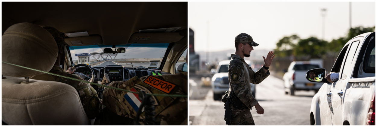 Bij de eerste post waar Alex langsrijdt, staat een forse rij auto’s te wachten om de basis op te mogen. ‘Genoeg water? Batterijen voor de portofoon?’ checkt Alex ondertussen bij de collega’s die snel maar nauwkeurig elke toegangspas scannen. Typisch aan verkenners is hun oog voor detail: dagelijkse bezoekers passeren zo vaak, dat de Nederlanders ze herkennen. Toch moeten ook zij nog steeds een geldige pas laten zien. Alex: “Alleen al door onze aanwezigheid proberen mensen zonder pas het steeds minder vaak. Ze weten dat we ze terugsturen; eerst een vingerafdruk en irisscan laten maken, terugkomen met een geldige pas.”