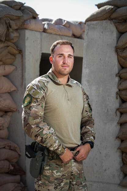 “Ik ben vier keer eerder op uitzending geweest; driemaal naar Afghanistan en een keer naar Mali. Dit is voor ’t eerst dat er een club reservisten is geïntegreerd. Het zijn collega’s met heel uiteenlopende achtergronden: studenten, ex-beroeps en zelfs een buschauffeur. Het zijn slimme lui. Ze komen wat brengen, zeker bij de taken aan de poort merk je dat ze ervaring in bewaken en beveiligen hebben. Voor de taken die we nu hebben in Irak zijn ze perfect geschikt.