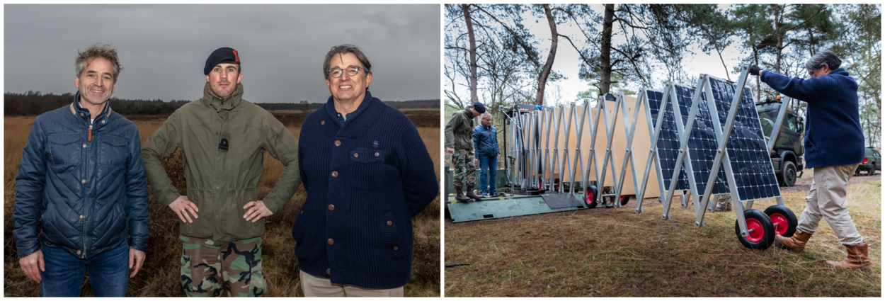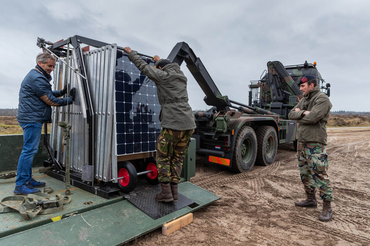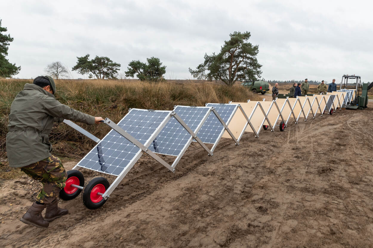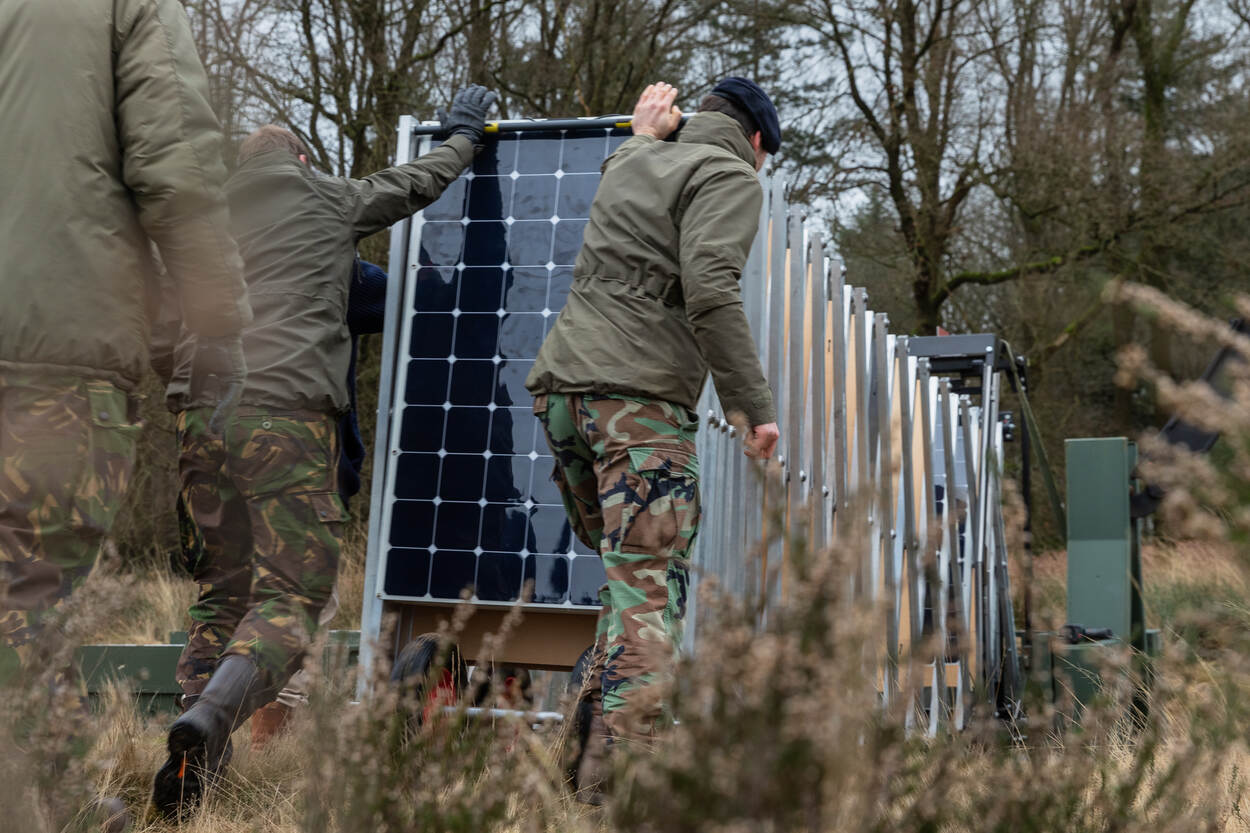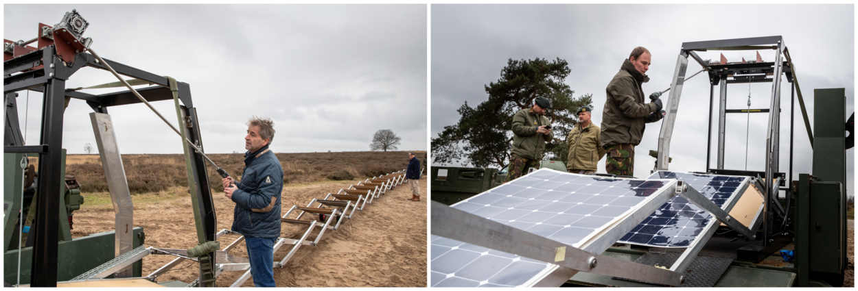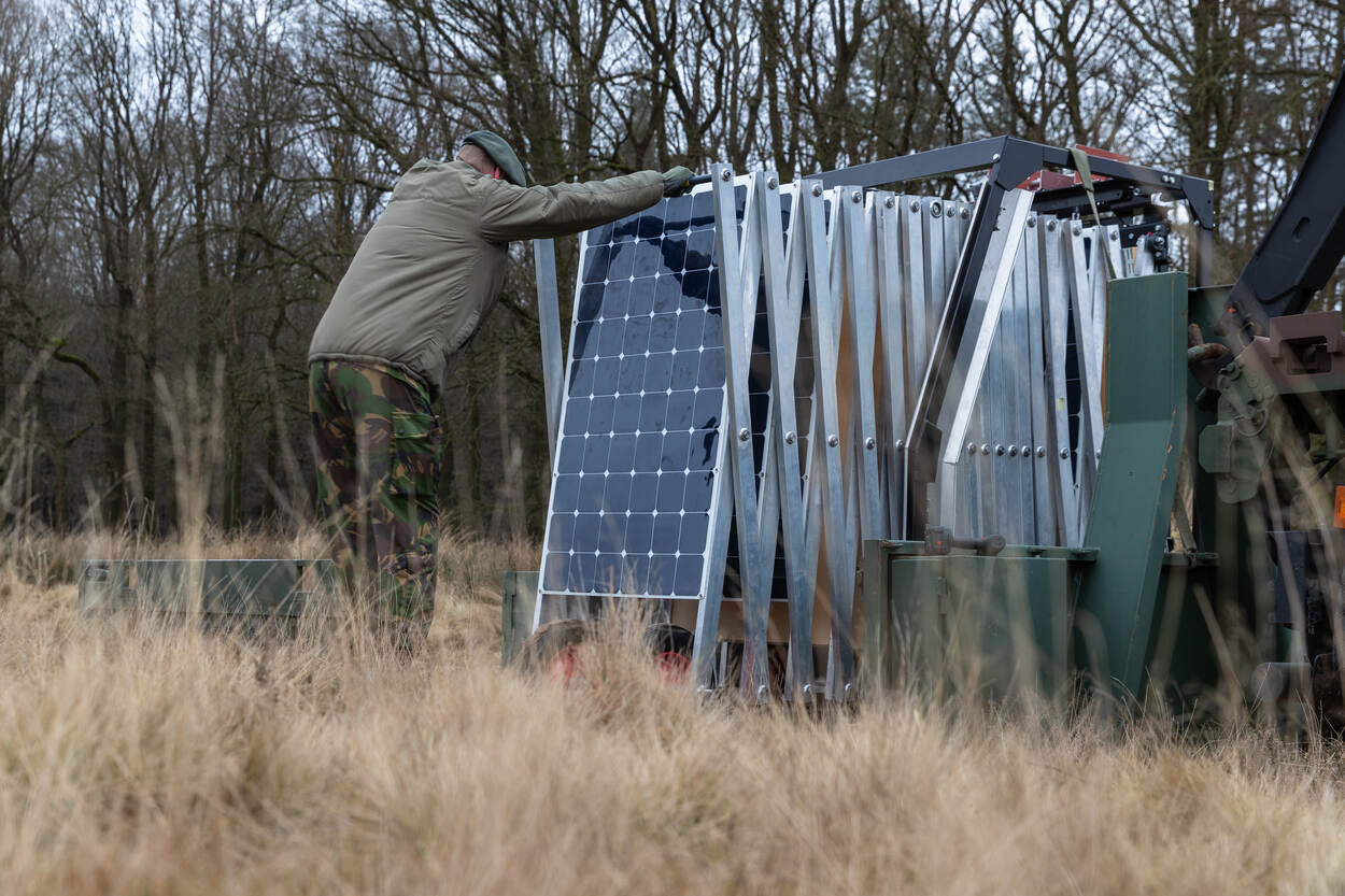 Pal achter Mobilisatiecomplex Ede-Driesprong op de Edese Heide zijn wandelaars getuige van een niet alledaags tafereel. Een grote, groene Scania wissellader zet een flatbed af, waarop een schaarmechaniek voor achttien zonnepanelen staat. Militairen trekken de 24 meter lange lichtmetalen constructie uit tot de panelen horizontaal liggen. In deze stand kunnen ze energie opwekken.