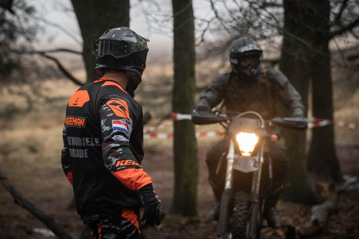 “Let op mannen! We beginnen vandaag met een paar rondjes inrijden op een single track. De ondergrond is hard, maar er zit een zachte bovenlaag op. Blijf gas geven, want anders gaat je motor glijden!”, instrueert Oldenziel zijn leerlingen. “We kijken hier goed naar het niveauverschil. De één is net omgeschoold op de nieuwe motor, de ander rijdt zelf ieder weekend offroad. Die eersten hebben wat meer individuele aandacht nodig en dat is prima!”, vertelt hij terwijl de eerste motoren er snerpend vandoor gaan.