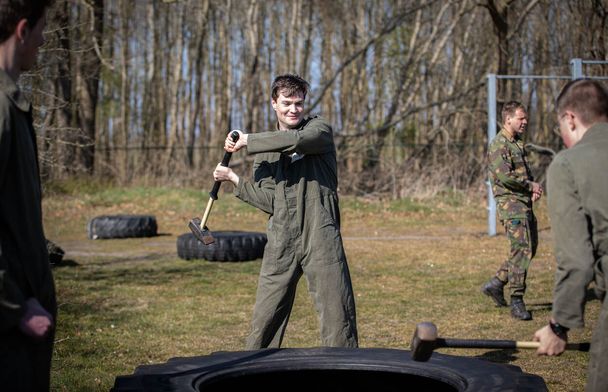 “Nog twintig minuten”, roept deelnemer Kevin Kerkenaar. Nu staat hij in groene overall een houten constructie te bouwen met zijn groep, maar normaliter doet hij jongerenwerk. “De MDT is iets strikter dan verwacht. Mooi, want die discipline heb ik wel nodig. Ik ben planningstechnisch niet zo sterk. En ik ben vrij assertief, neem graag de leiding: daarin moet ik nu een beetje afschalen. Nee, er wordt niet constant geschreeuwd, maar de opdrachten worden wel heel helder gecommuniceerd. Er is geen speld tussen te krijgen. Bijzonder om te zien hoe je met een groep individuen, onbekenden van elkaar, samen in korte tijd iets kan laten bereiken. Iedereen zet zich in en draagt zijn steentje bij.”
