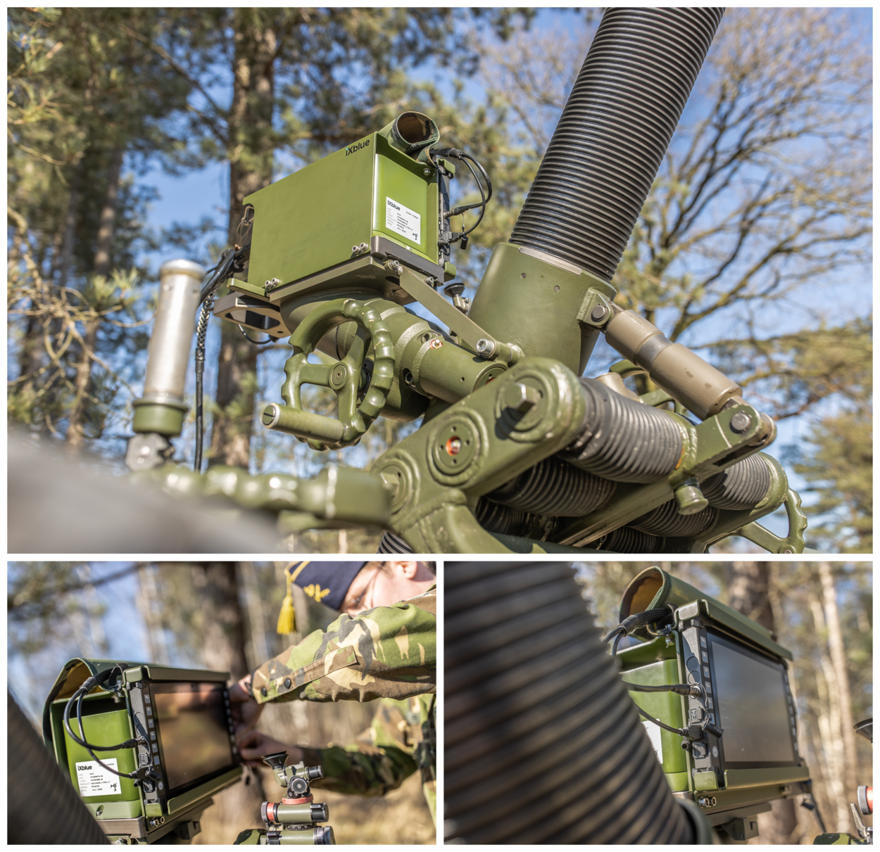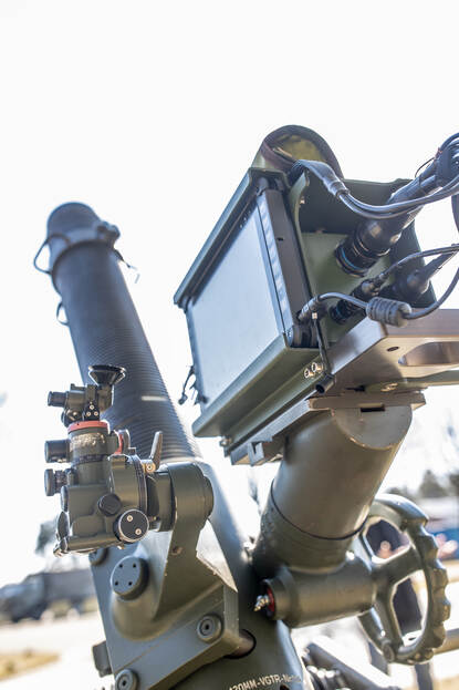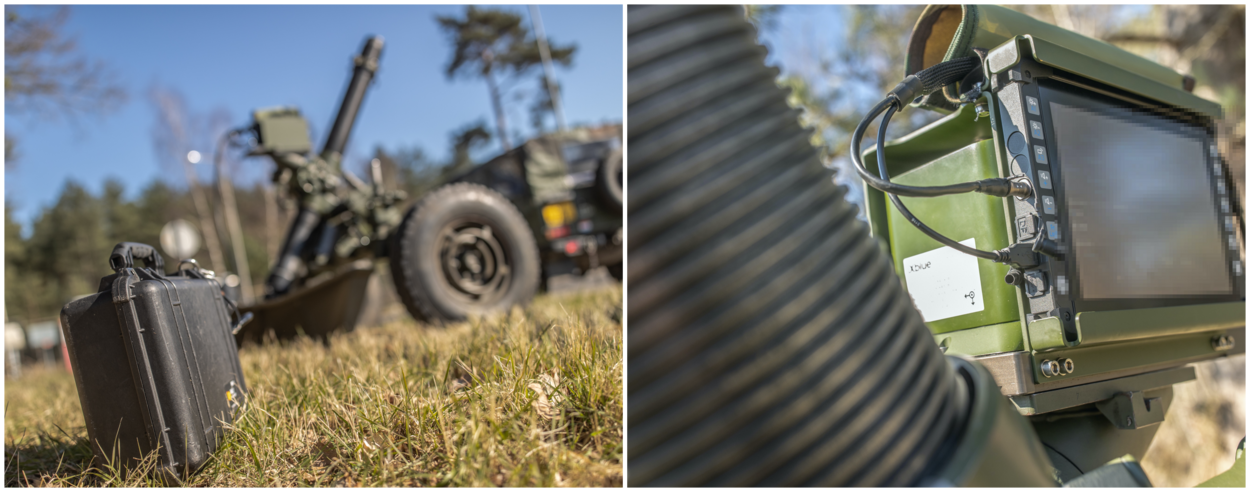 Voor de 120mm is, om de plaats- en richtingbepaling te doen, één hardware-oplossing gekozen voor op de mortier. “De tablet waarop we de gegevens uitlezen, kun je tijdens transport in het voertuig bevestigen. Waarmee de stukscommandant dus ook tijdens het verplaatsen zonder GPS weet waar hij zich bevindt. Dáármee boeken we tijdwinst. De vuurregelaar heeft nu meteen bij aankomst zijn plaats- én richtingbepaling. De mortier staat direct in stelling om te vuren. Nu moet je dat eerst nog ter plekke doen met de Northing Finding Model, die daarvoor dus drie minuten nodig heeft”, legt stukscommandant wachtmeester Mike te Winkel tijdens een van de beproevingen uit.