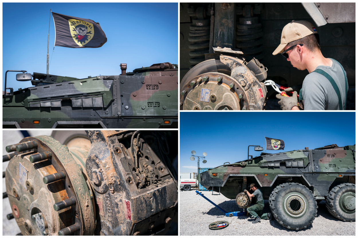 Sergeant Matthijs (43 Herstelcompagnie) en zijn mannen konden vóór de oefening was begonnen al aan de bak met de Boxers. “Motor eruit, zelf een hijsjuk gelast en elke dag na oefening inspectie”, somt hij op. “We konden beperkt middelen meenemen en dan is het een uitdaging als er iets afbreekt en we hebben het niet. Je moet dus creatief zijn en dat willen we ook: sleutelen. Dus ook als er een doel kapot wordt geschoten, herstellen we die, net als de sloten op wc’s en douches.”