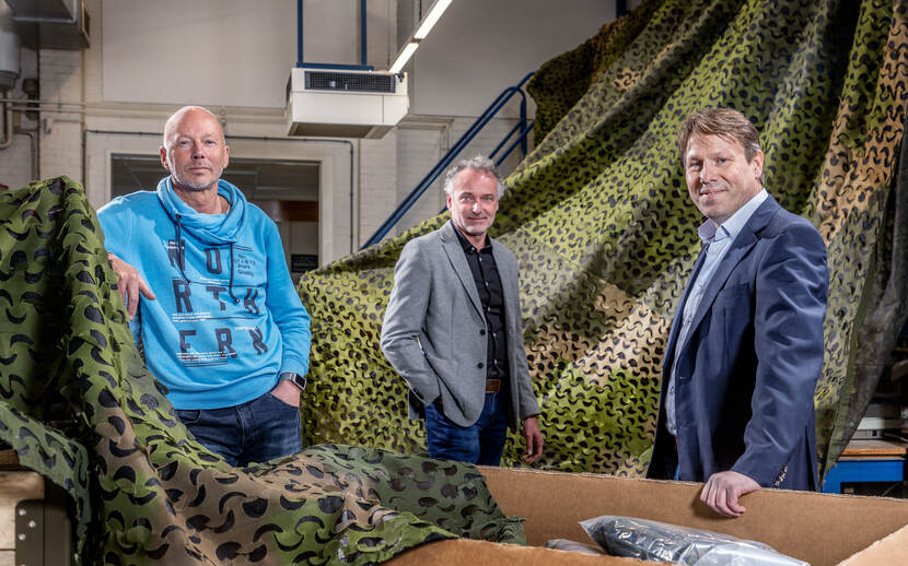 V.l.n.r.: Alfredo Leenderts (KC OTC-Genie), Martin Voorma (MIS7, adaptieve camouflage) en Luc van Arem (Wiba Zevenaar/SAAB).