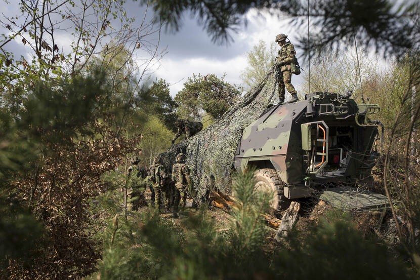 Een oefening van 17 Painfbat in Frankrijk. De Boxer wordt bekleed met de ‘ouderwetse’ camo-netten.