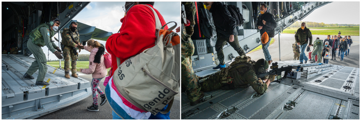 Na een uur is de situatie op de luchthaven van Fromonia veilig genoeg bevonden om de Rapid Air Evacuation uit te voeren. De evacuatie per vliegtuig is onderdeel van de NEO. Samen met de Duitse collega’s van de Divison Schnelle Kräfte begeleiden de luchtmobielers de evacués in groepjes naar het transportvliegtuig. Sommigen raken in paniek als ze worden gescheiden van familieleden. Anderen zijn plots moeilijk ter been. De oefenevacués zitten goed in hun rol om de chaotische situatie van een evacuatie-operatie na te bootsen. “Wij gaan verder dan lotuspatiënten”, stelt een figurant trots.