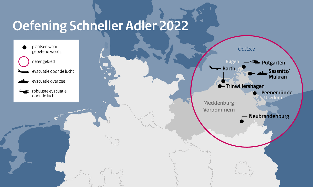 “Het grootste voordeel van samen oefenen is dat we meer inzicht krijgen in elkaars werkwijze. Dat is belangrijk met oog op de mogelijke evacuatie-operaties in de toekomst.” Maar, waarschuwt de compagniescommandant, als zulke operaties een prioriteit voor zijn brigade worden, zal het niveau van de ondersteuning omhoog moeten. “We hebben meer combat support en combat service support nodig. Alleen zo kunnen we procedures opzetten om NEO-operaties in de toekomst mogelijk te maken. Tijdens Schneller Adler waren bijvoorbeeld genisten, luchtverdediging en GNK heel wenselijk geweest. Nu moesten we transporttoestellen van de Duitsers gebruiken omdat de Nederlandse vliegtuigen geen capaciteit hadden. Meer en beter inzetbare transportvliegtuigen zijn hard nodig.”
