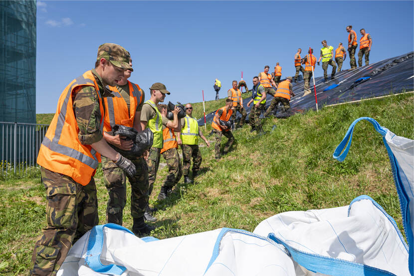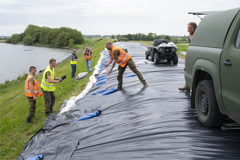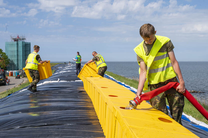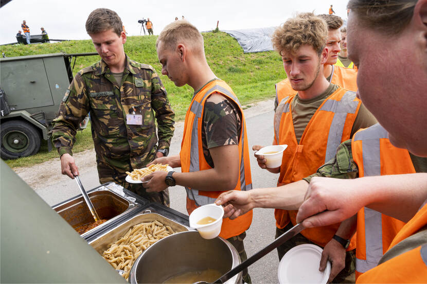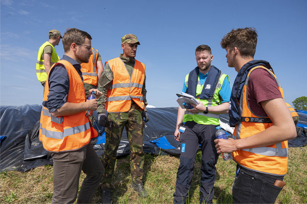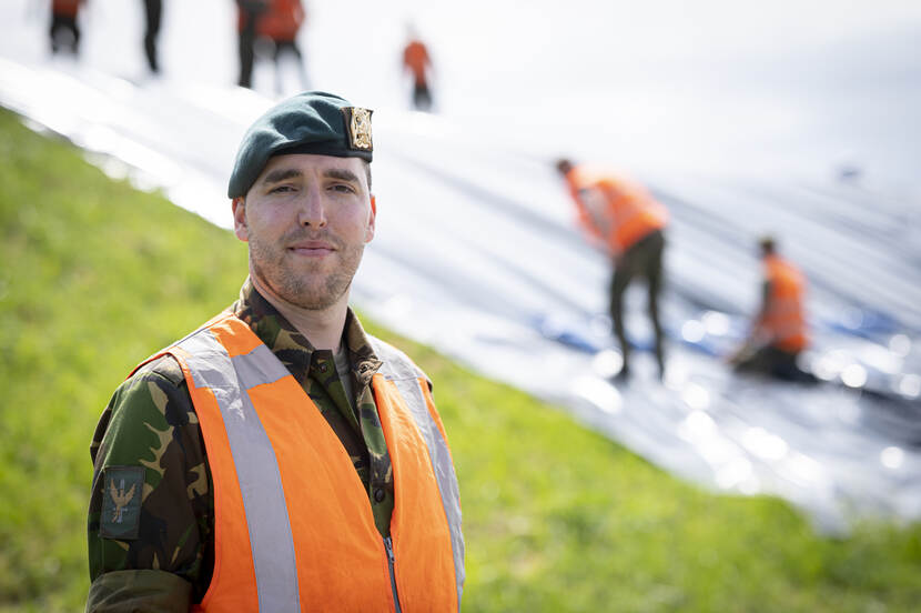 Op de dijk vuurt eerste-luitenant Van der Peijl, pelotonscommandant Advanced Constructieteam van 103 Constructiepeloton, de troepen onophoudelijk aan. “Vanwege de klimaatverandering is het een goede zaak om dit te trainen”, vertelt hij. “Als de nood aan de man komt moeten wij dit kunnen. Nu is het mooi weer, over bijvoorbeeld een maand kan het mis zijn. In de voorbereiding is het belangrijk om na te gaan wie het materiaal aanlevert: wij of onze civiele partner? Hoe meer je dingen weet van de andere partij, hoe beter. Die werkt nu eenmaal anders dan wij. Er staat hier een tevreden man. We oefenen in iets waarmee we de bevolking kunnen helpen als het erop aankomt. Dankbaar werk.”