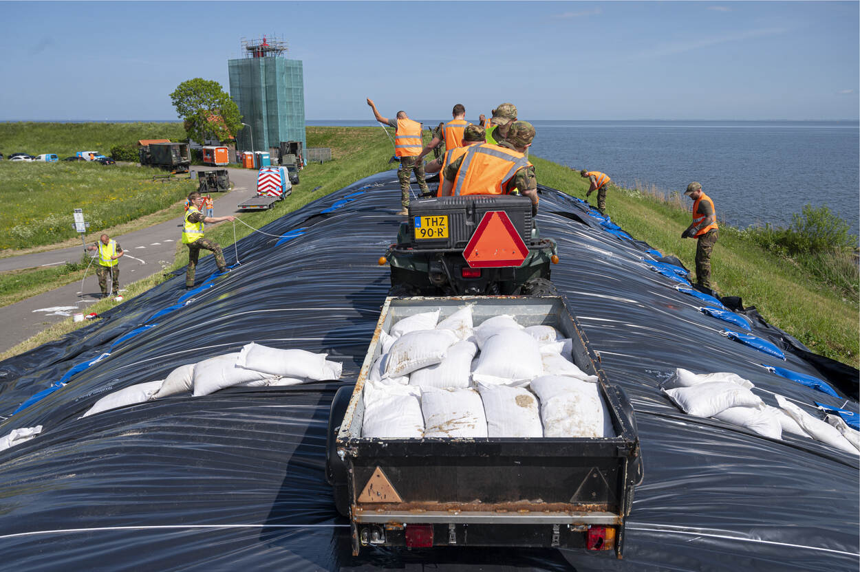 In de afgelopen uren hebben de bewoners van de Prinses Margrietkazerne in Wezep de dijk ‘ingepakt’ met grijze dijkzeilen die stevig zijn vastgepind. Daarover worden witte lijnen gespannen om zo de boel nog vaster te krijgen. Als de woeste golven zich op de dijk storten spoelen er dankzij deze techniek geen dijkdelen naar beneden, het achterland in. Overal en vooral op de randen van de zeilen komen zandzakken te liggen. Dat maakt de boel nog steviger. “Hee, let op. Die zakken daar moeten hoger komen. Er mag geen water onder het zeil komen. En span dáár nog even een touw.”