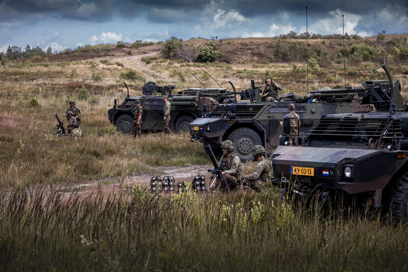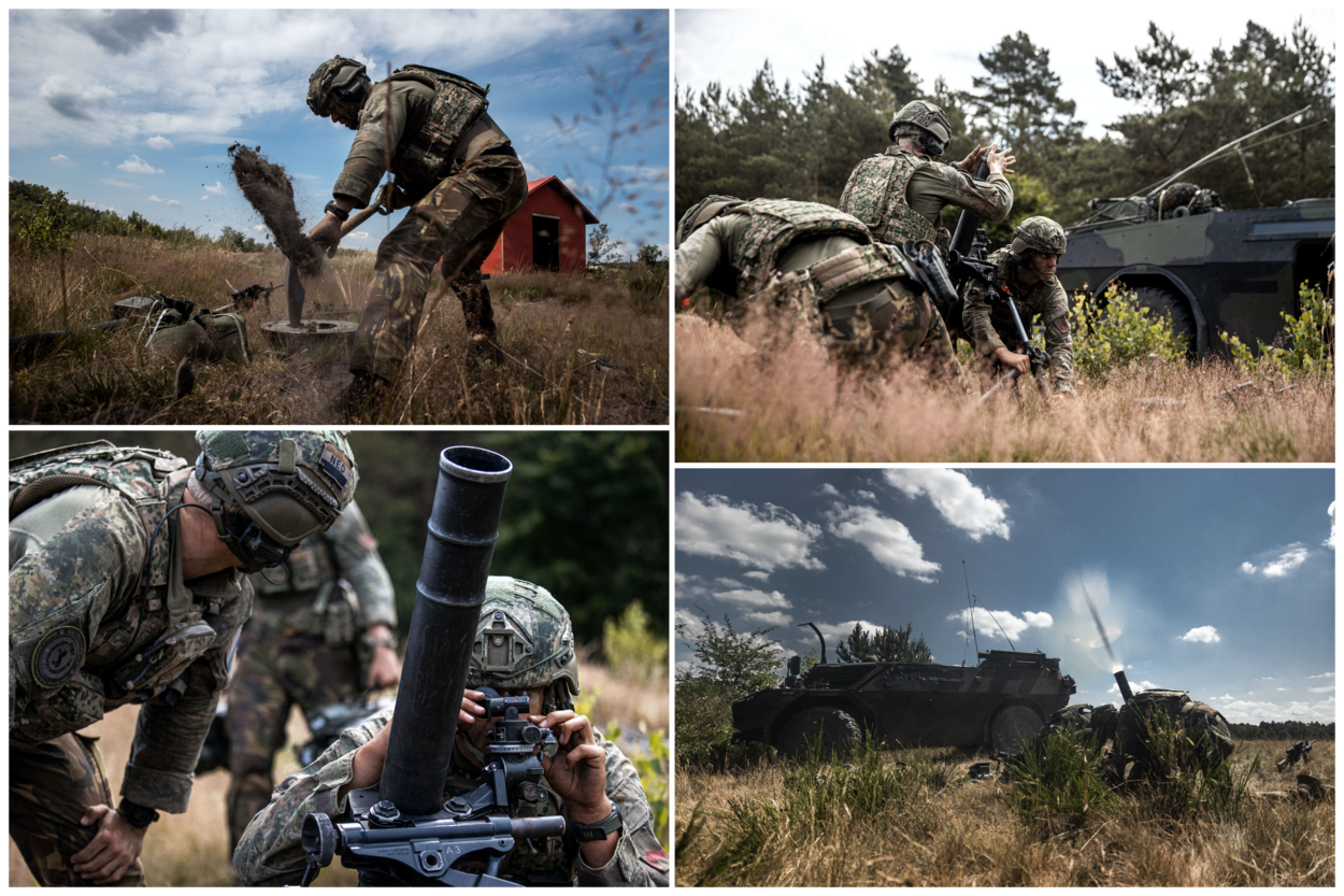 Als het even ‘rust bij de stukken’ is op schietbaan 1A op oefenterrein Bergen-Hohne, verkent een moeder-everzwijn de omgeving. Niet veel later gevolgd door een zestal spichtige jonkies. Na een korte pauze zoeft even later eerst een Sky Ranger door de lucht. Vervolgens schieten de Fenneks van 43 Brigade Verkenningseskadron Huzaren van Boreel in een grote stofwolk uit de startblokken voor een volgende run,samen met de mortiergroep van 44 Pantserinfanteriebataljon Regiment Johan Willem Friso.
