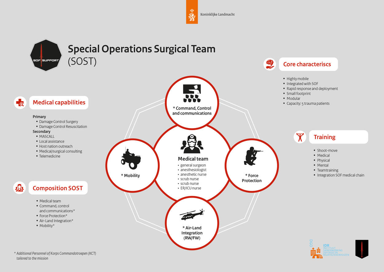 Het special operations surgical team bestaat uit een (trauma)chirurg, een anesthesioloog, een anesthesieverpleegkundige, twee operatieassistenten en een IC/SEH-verpleegkundige. Met ieder een rugzak kunnen ze al aan het werk en is het team inzetbaar. Alle medici zijn zorgvuldig geselecteerd en moeten fysiek en mentaal weerbaar zijn. Damage control resuscitation en surgery zijn de hoofdtaken en dat met snelle reactietijden en een kleine logistieke footprint. Het materiaal dat ze meenemen - van behuizing tot het minimale van een aantal rugzakken - is modulair, dus aan te passen aan de omstandigheden. Het concept is niet nieuw, er zijn meer NAVO-landen met deze capaciteit, maar de inrichting verschilt. Het Nederlandse SOST is van de grond af opgebouwd, zegt een van de initiatiefnemers.