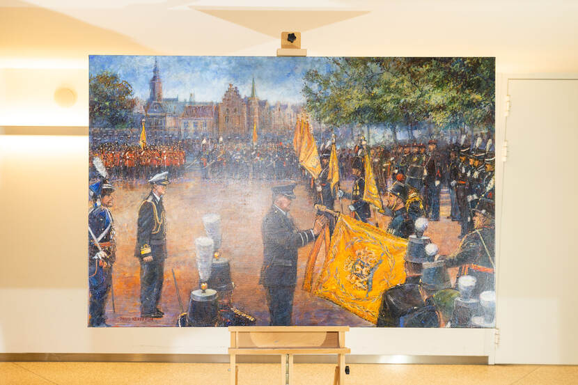 De uitreiking van de vaandelopschriften (vorige zomer in Den Haag) is vastgelegd in een kunstwerk. Paul Kerrebijn maakte het schilderij in opdracht van Defensie.