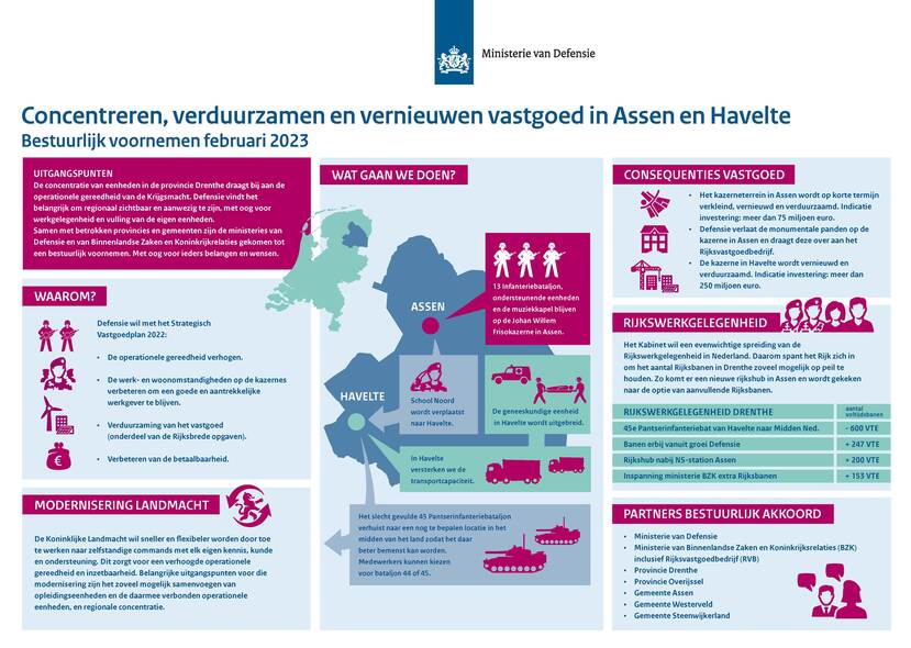 De Johan Willem Frisokazerne in Assen blijft de thuisbasis van 13 Infanteriebataljon. Ook de Koninklijke Militaire Kapel en ondersteunende diensten blijven er gehuisvest. School Noord verhuist naar de Johannes Postkazerne in Havelte. Defensie gaat fors investeren in het vastgoed op beide Noord-Nederlandse locaties.