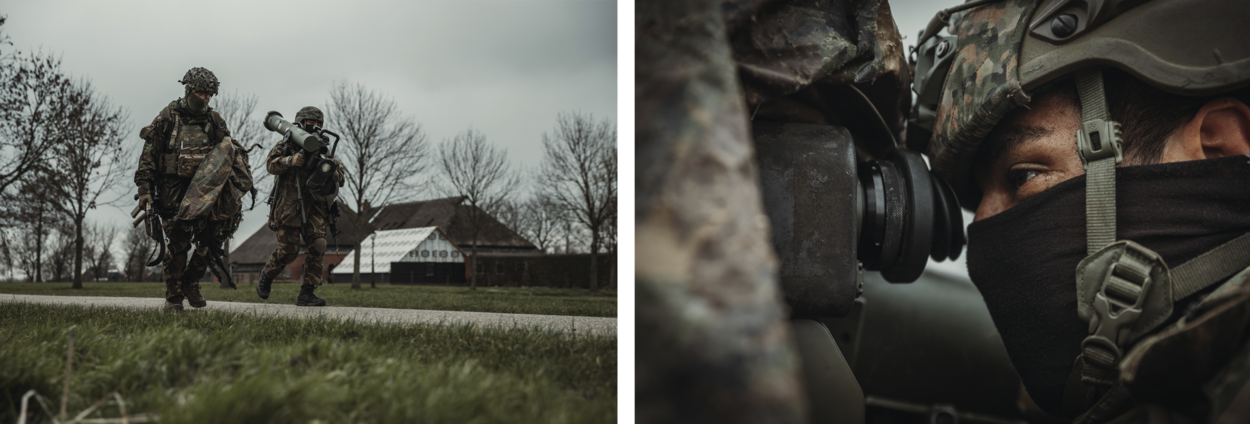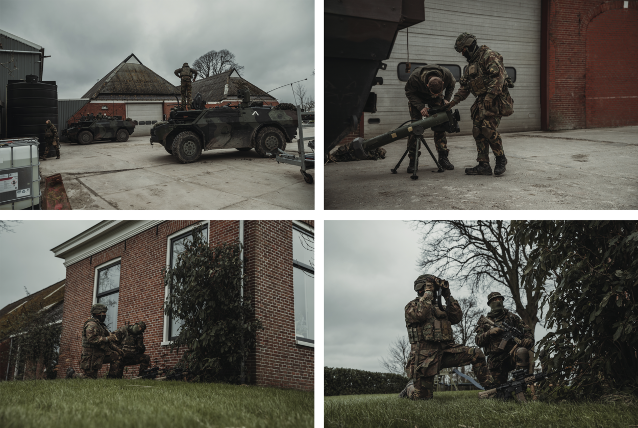 Eigenlijk is dat nu precies wat de deelnemers, het verkennings- en het antitankpeloton, niet willen: zichtbaar zijn. “Maar”, stelt sergeant Ricky, “daar ontkom je hier bijna niet aan. Het vlakke en open terrein biedt weinig mogelijkheden om ongezien te naderen. Voor ons als antitankers is het dan weer een voordeel, het doel is gemakkelijker te bepalen.” Geruisloos gaat het in Warfhuizen trouwens ook al niet, want terwijl de Fenneks zich opstellen, beginnen de klokken van de eeuwenoude Kluizenarij te luiden.