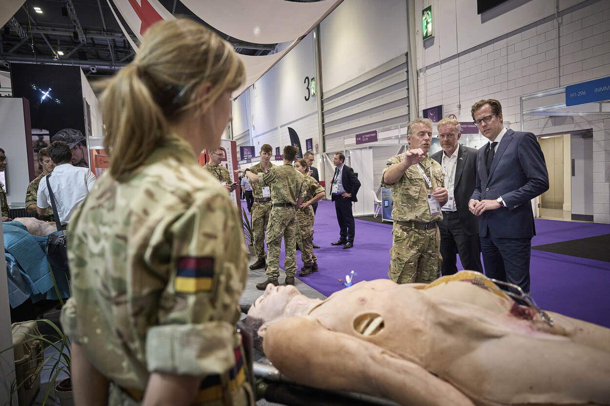 Staatssecretaris Christophe van der Maat (rechts) en Fons van der Ham (midden) luisteren naar kolonel-arts Giles Nordmann. Het Verenigd Koninkrijk biedt innovatieve inzichten in de behandeling van gewonden.