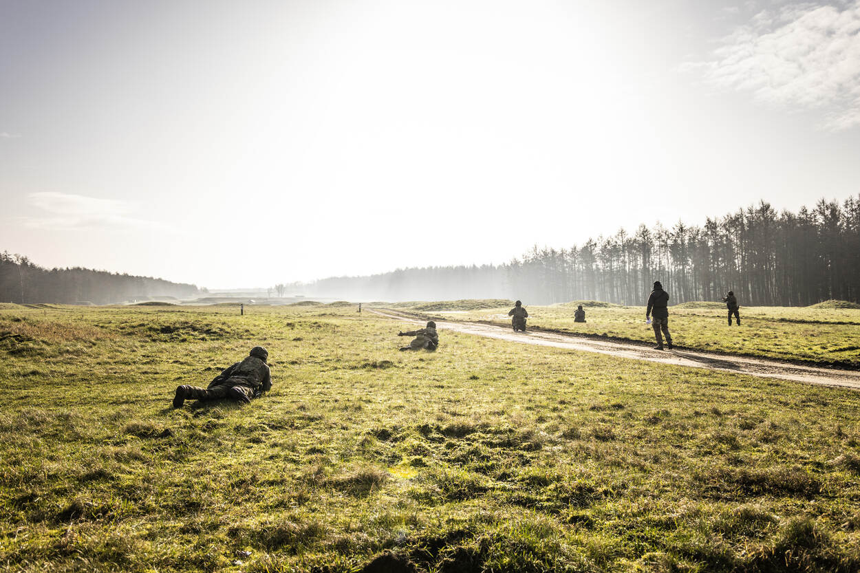In totaal oefenen vandaag drie groepen, om in actie te komen. Zodra ze het veld inlopen, wordt al snel het eerste vuur geopend. Staand, knielend, liggend; vanuit alle posities worden de vijandelijke linies verderop in het veld onder vuur genomen. De groepscommandant beweegt zich achter zijn mannen en geeft instructies. Op nog geen halve meter daarachter houden de hoofdschietinstructeur  en de baancommandant het geheel in de gaten. De groepen zetten drie typen vuurwapens in. In de groep hebben de meesten een Colt C7 bij zich. Daarnaast zijn er twee Minimi’s en de zwaardere MAG. Sergeant-majoor Roel Hoogervorst: “De MAG heeft het grootste kaliber en ‘de verste dracht’. Deze kan doelen tot 800 meter uit de lucht schieten.”