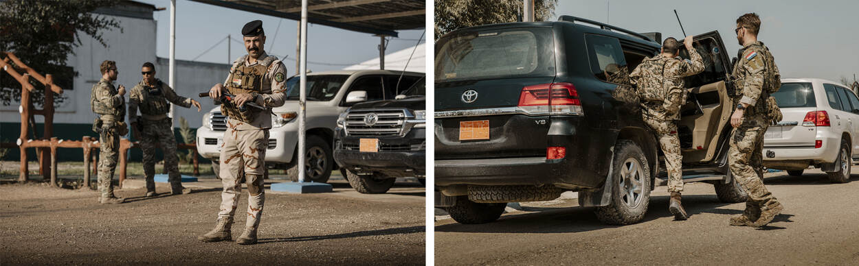 De zon komt langzaam op boven UNION III – sinds begin januari de thuisbasis van de luchtmobielers uit Assen – terwijl soldaat-1 Sheldon met de rest van zijn team de rit voor de dag doorneemt en de Land Cruiser klaarmaakt voor vertrek. Vandaag begeleidt zijn groep een Duitse overste naar zijn afspraak bij de Iraakse artillerieschool. Morgen kan het een sergeant-1 zijn, of een ambassadeur. Sheldon heeft ze als bodyguard allemaal langs zien komen. “Ook al zijn ze al tien keer mee geweest, iedere keer krijgen ze opnieuw de pax-briefing. Want stel dat er iets gebeurt, is het goed dat we er met de adviseur scherp op zijn geweest, zodat die precies weet hoe hij moet handelen en wat wij doen bij een dreiging.”