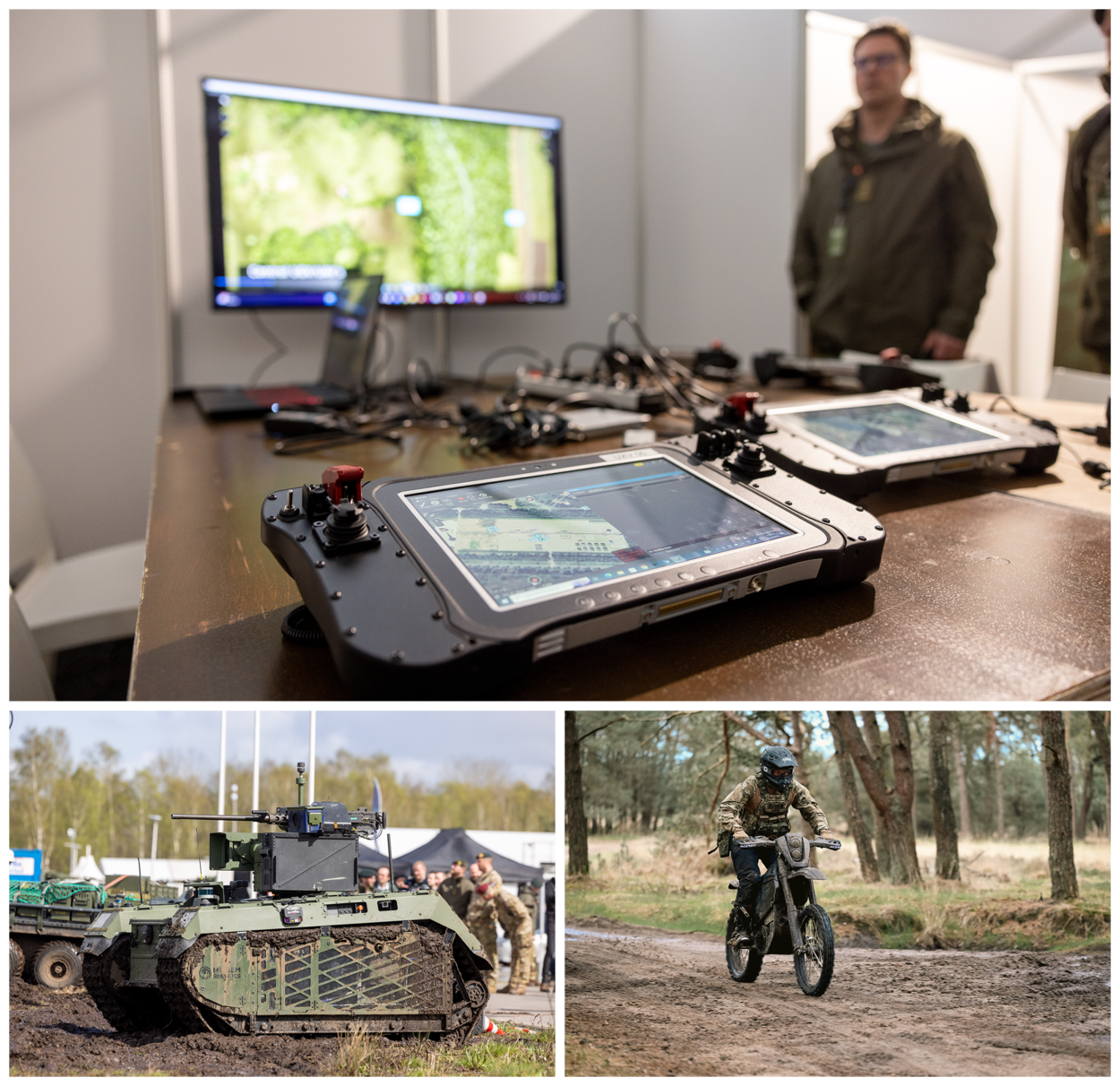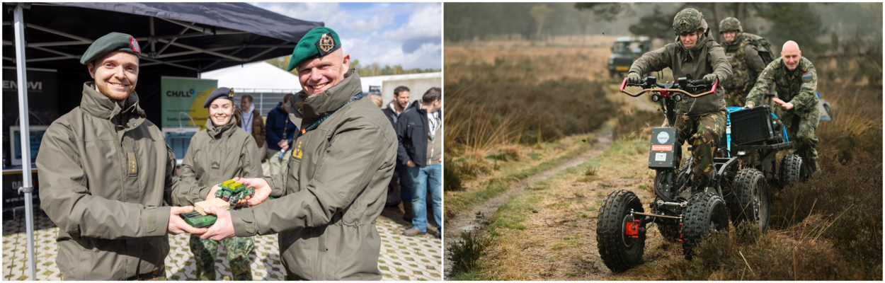 Op deze drie verschillende foto’s zie je diverse innovatieve voertuigen maar ook andere innovaties die een plekje innemen tijdens de innovatie-oefening Next Generation Concept Development die in april plaatsvond in Ede.