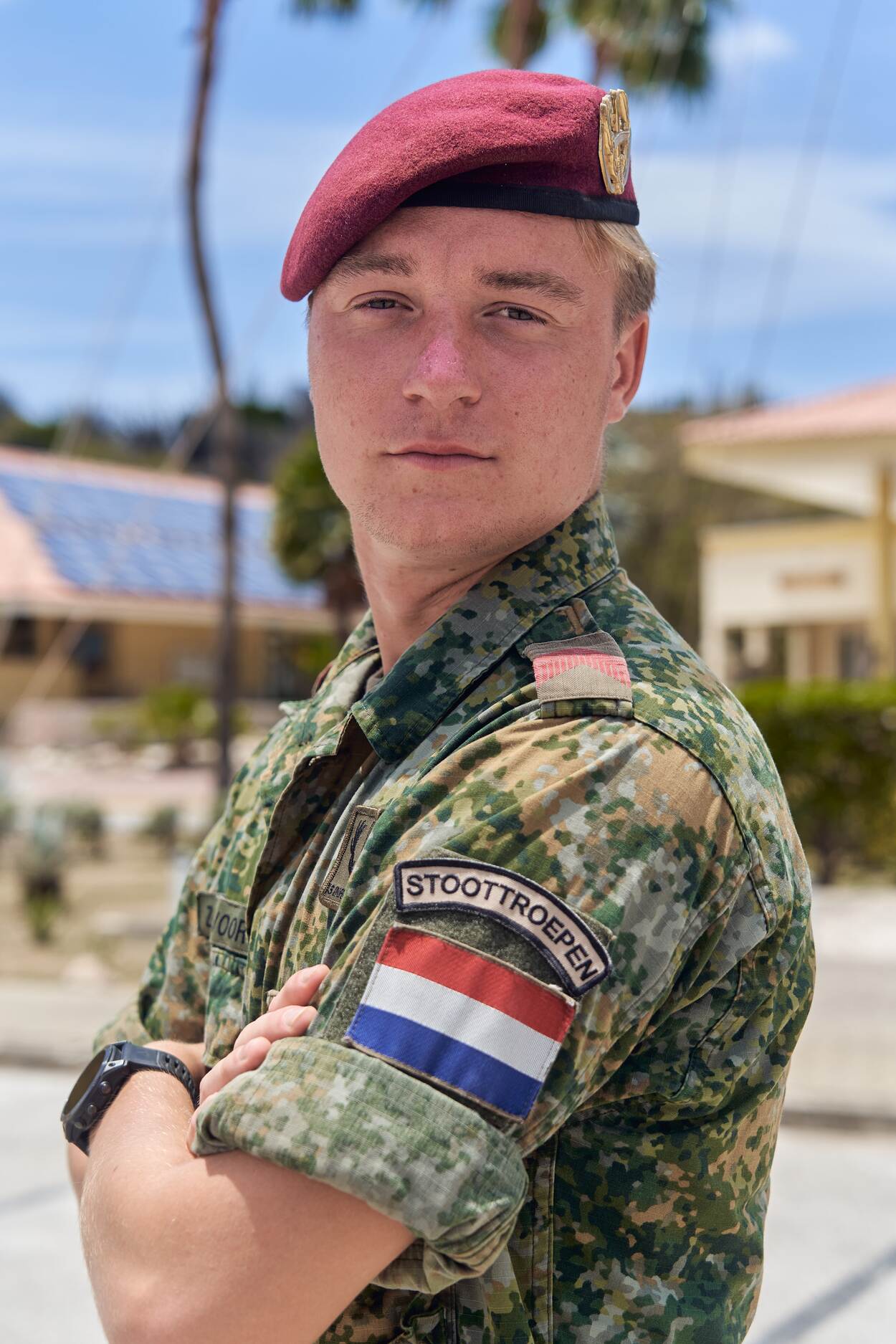 ‘Op mij maakte de belofte van Curaçao weinig indruk. Als kind was ik al geïnteresseerd in het leger. Ik hield van Rambo-films en wilde graag met wapens werken. Ik heb het even als manager in de retail geprobeerd. Maar dat werd niets. De drang om bij het leger te gaan, bleef aanhouden. Als Minimi-schutter geef ik nu ondersteunings- en dekkingsvuur. Mooi werk! Daarmee kwam een droom uit. Dat er regionaal geworven werd, is leuk. Maar ik had me sowieso wel aangemeld.’